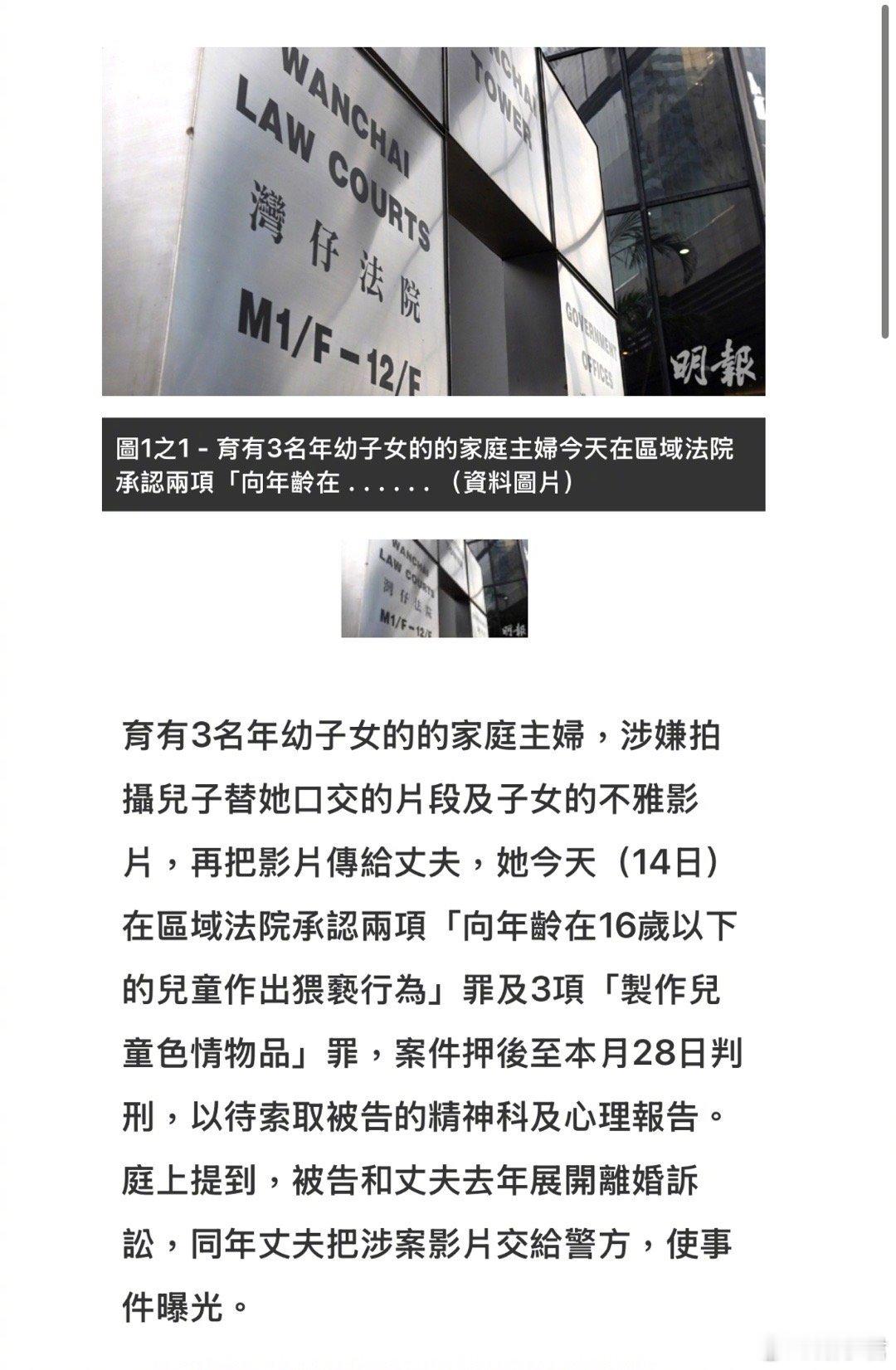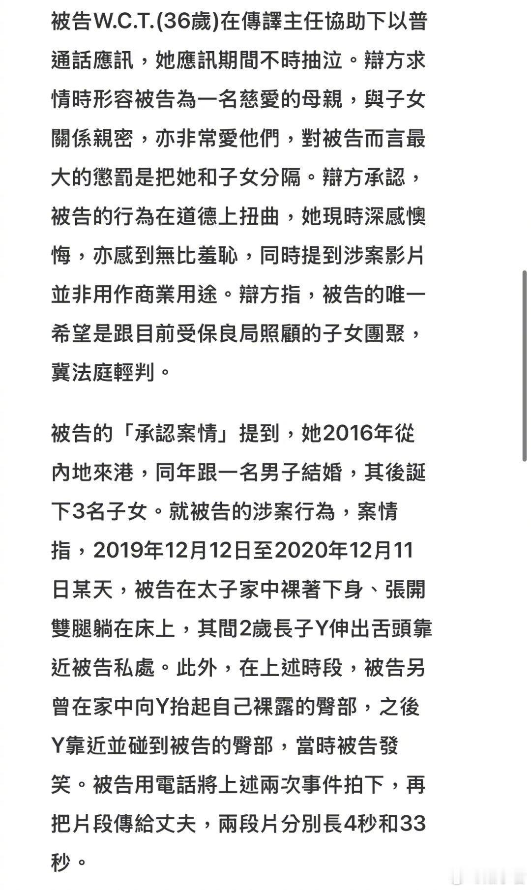 一名36岁的家庭主妇,跟丈夫育有2子1女。在2019年至2022年间在太子单位内,该主妇向年仅2岁的长子展露下体,并拍摄长子为她口j的过程,其后将影片转发丈夫观赏。