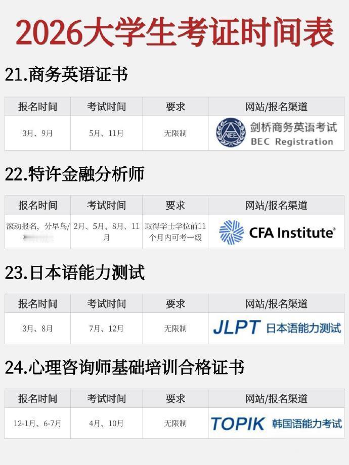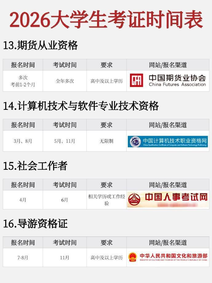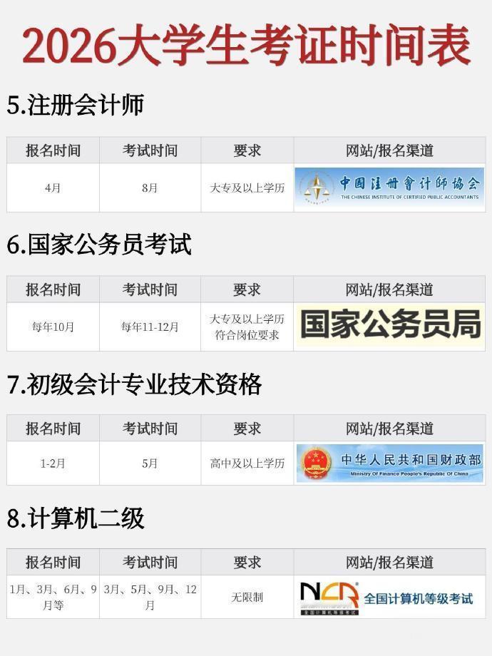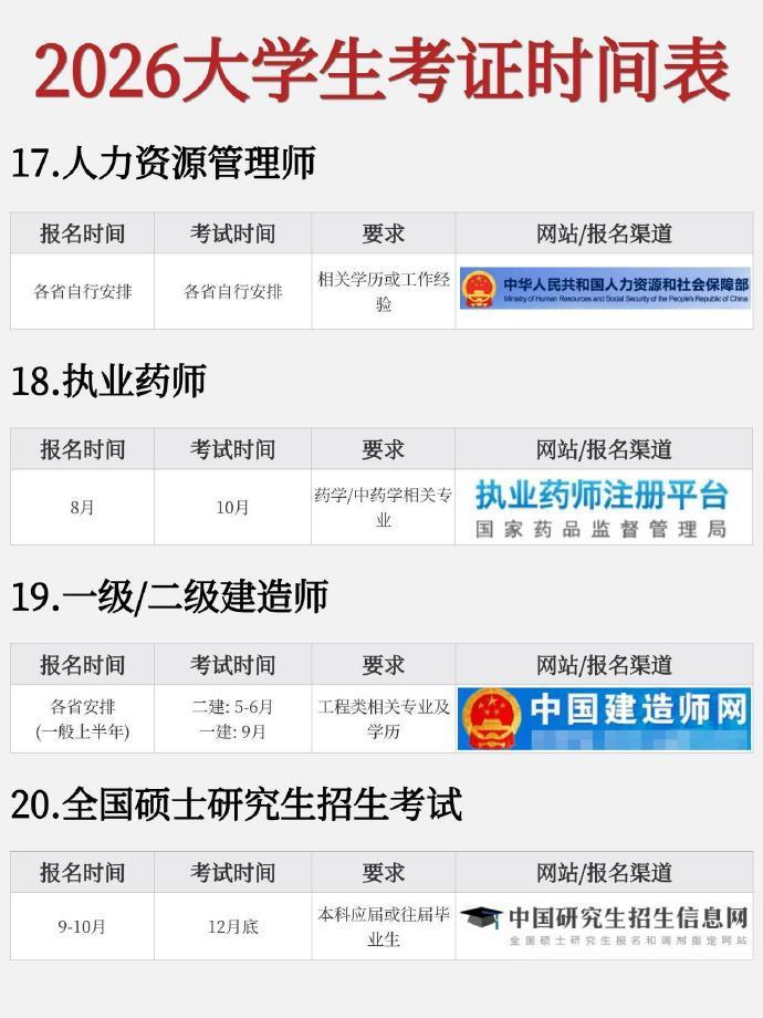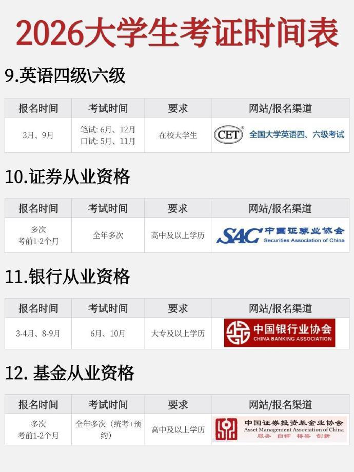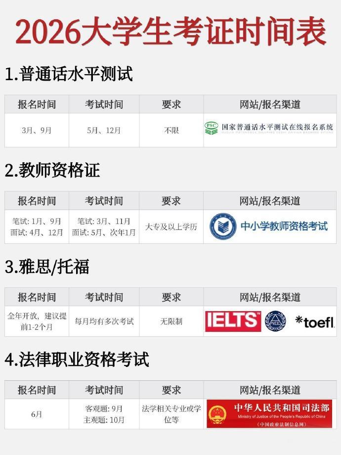 2026年大学生四年考证时间表,全都给大家整理出来了,什么普通话水平测试、教师资格证、雅思、托福、法律职业资格考试、计算机技术与软件专业技术资格以及导游资格证等,每一个的报名时间、考试时间、要求以及报名渠道,全都写得一清二楚。家长们快替孩子保存下来,一定要让孩子看一看,让孩子大学期间多考证,千万别错过这些考证的时间了,否则再等一年。#寻美三湘##长沙新朋友#