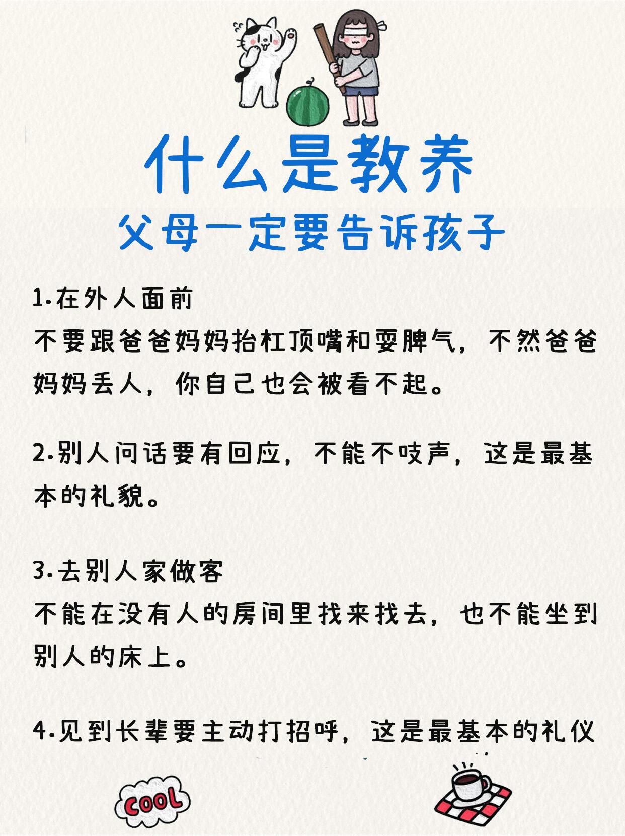 什么是教养?这是我见过一个最完美的答案,解释的非常详细清楚,父母一定要告诉孩子。家长们快保存下来,有些事,父母不教,孩子永远都不会。原生家庭影响的不止物质,还有三观。没事多跟孩子讲一讲,孩子越长大越优秀,从小就有养成良好的教养。#寻美三湘##长沙新朋友#