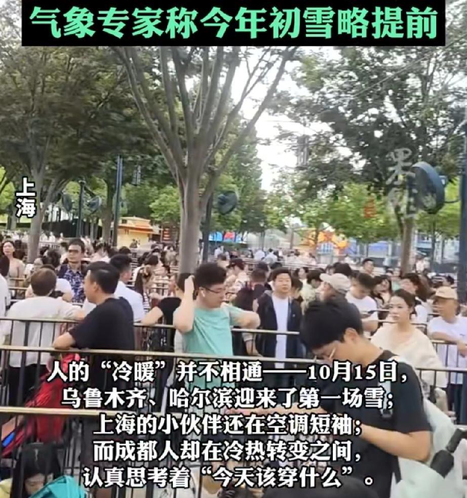 山河若夜映晓空,南北温差不同调 南方露腰,北方裹貂 今天上海的小伙伴还在空调短袖,乌鲁木齐,哈尔滨等地已迎来第一场雪。 每逢秋冬交替时,“南方露腰,北方裹貂”的戏言总会成为热议焦点。这幽默的反差背后不仅揭示了中国广袤地域的独特气候、地理风貌,更映照出不同地区人们的多样生活与季节印记。 10月份,东北的街头人们已经穿着厚重的羽绒服,呼出的白气在寒冷的空气中清晰可见,大部分人都在忙着囤货,准备猫冬。南方的广州等地,市民们穿着短袖、短裙喝着冰饮,厦门的海边沙滩上依然有游客穿着泳衣嬉戏,丝毫感觉不到秋冬的寒意。 对于一些需要频繁跨区域出行的人来说,一日经历四季已成常态,南方的热浪滚滚,北方的寒风瑟瑟,仿佛是一日之内穿越了四季。 现在温差变化特别大,一定要随时添加衣服,注意保暖。 你们那边现在是什么样的天气?是露着腰呢?还是裹着貂呢? 下雪了 南方温度差异 北方气温 南北天气差别 东北气温骤降