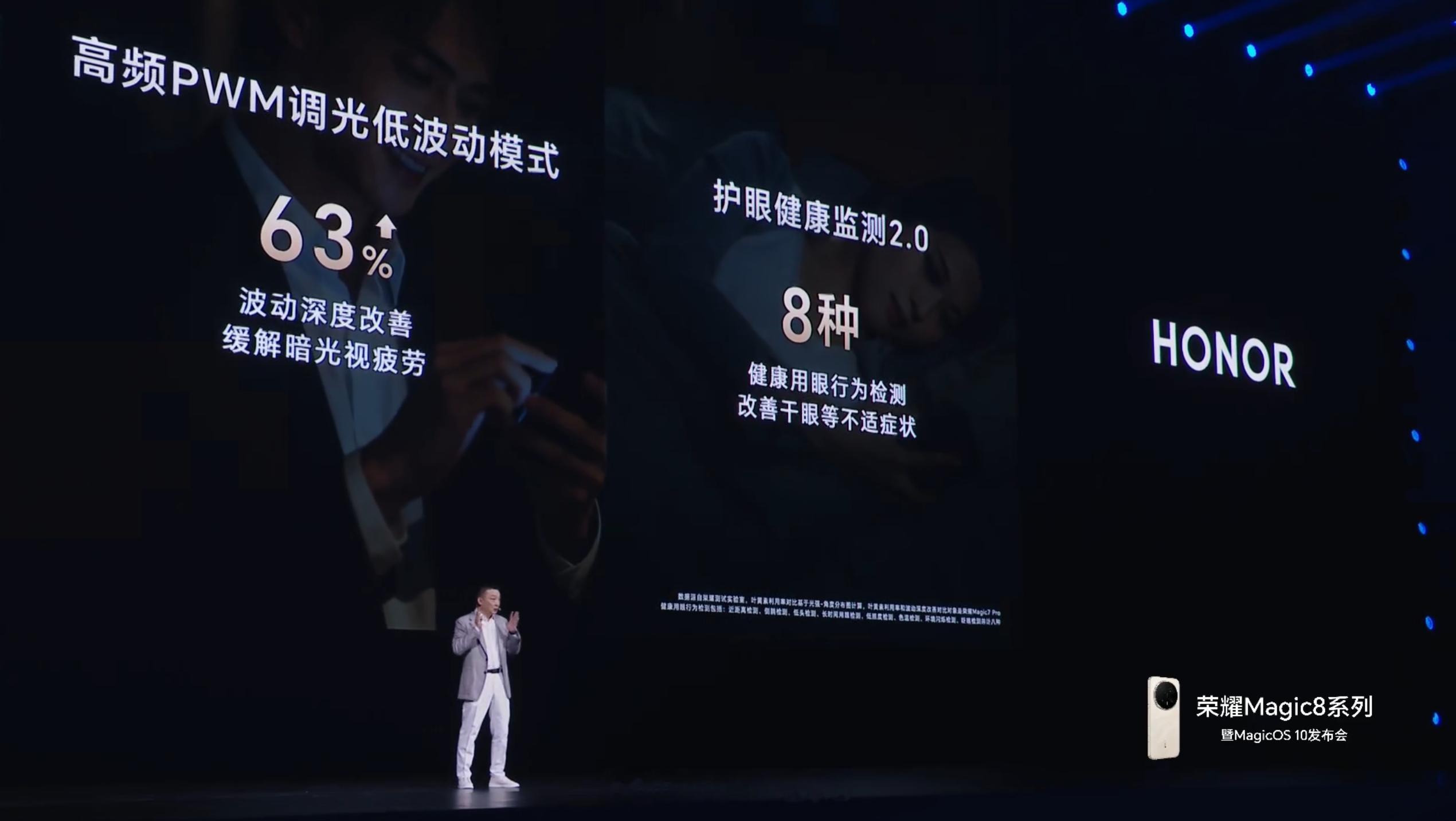 荣耀 Magic8 Pro 采用 6.71 英寸 2808×1256 OLED 四曲屏,120Hz 刷新率(1-120Hz 8T LTPO),全局峰值亮度 1800nit,局部峰值亮度 6000nit,屏幕最低亮度 1nit,4320Hz 高频 PWM 调光,AI 离焦护眼 2.0,圆偏振光 2.0,荣耀巨犀玻璃。荣耀发布会