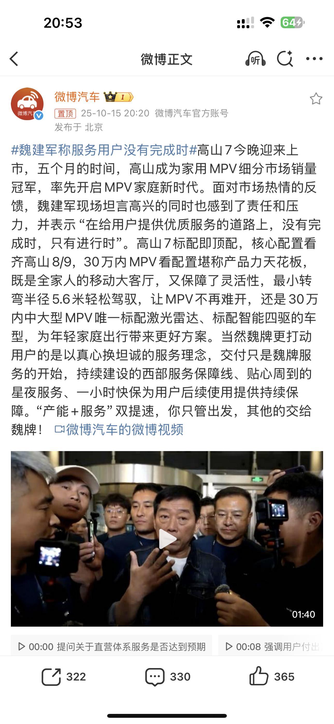 魏建军称服务用户没有完成时魏牌高山7今晚正式登场,期待值拉满,才五个月,高山就拿下家用MPV销量冠军,果然家庭用户都认它!