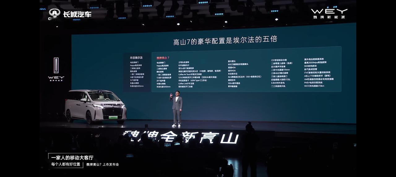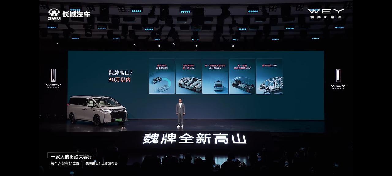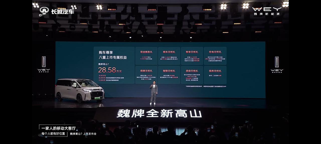 魏牌高山7来了,售价28.58万元,8重购车权益,8000元选装零重力座椅,2000元选装铝合金轮圈,打着“一家人移动大客厅”的口号,咱往深了探探,30万价位区间,舒适度、空间都不错,最大的特点是灵活,车长5米出头,转弯半径5.6米,驾驶起来更容易走街串巷。 冰箱彩电大沙发都不缺,还标配4驱和激光雷达,双15.6英寸中控屏+17.3英寸后排吸顶屏,纯电续航172公里,综合续航945km,油品还不挑,配置给的恰到好处。高山家族已经全部和大家见面了,适合的才是最好的,高山9肯定是旗舰担当,高山8主打大家庭用户,而高山7特别适合年轻家庭,从价格分布,细分人群和功能分配,基本覆盖了MPV市场的所有口味。 魏牌这次又表白用户,交付速度只是服务的一项,有持续建设的西部服务保障线,有贴心周到的星夜服务,之后他们要做到产能+服务双向出发,不断提升用户的满意度。【来自懂车帝车友圈】