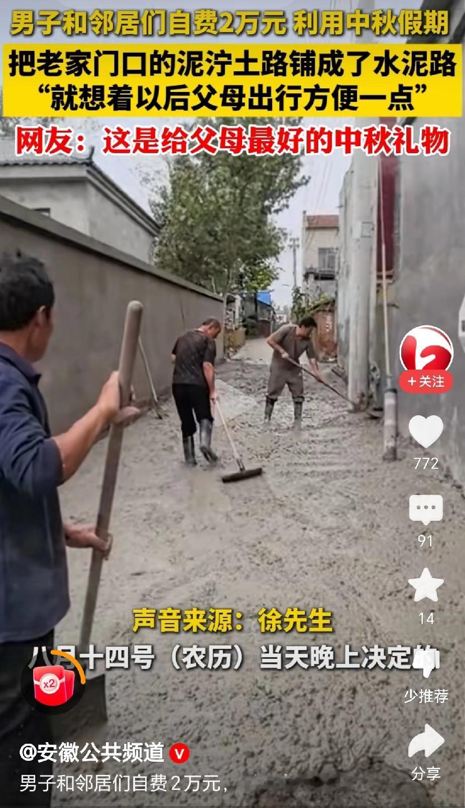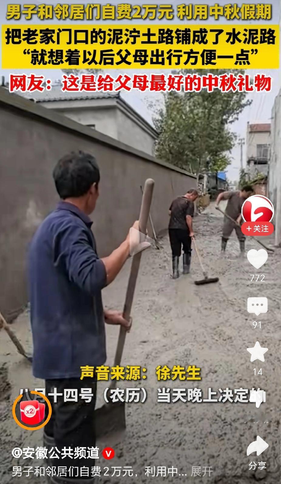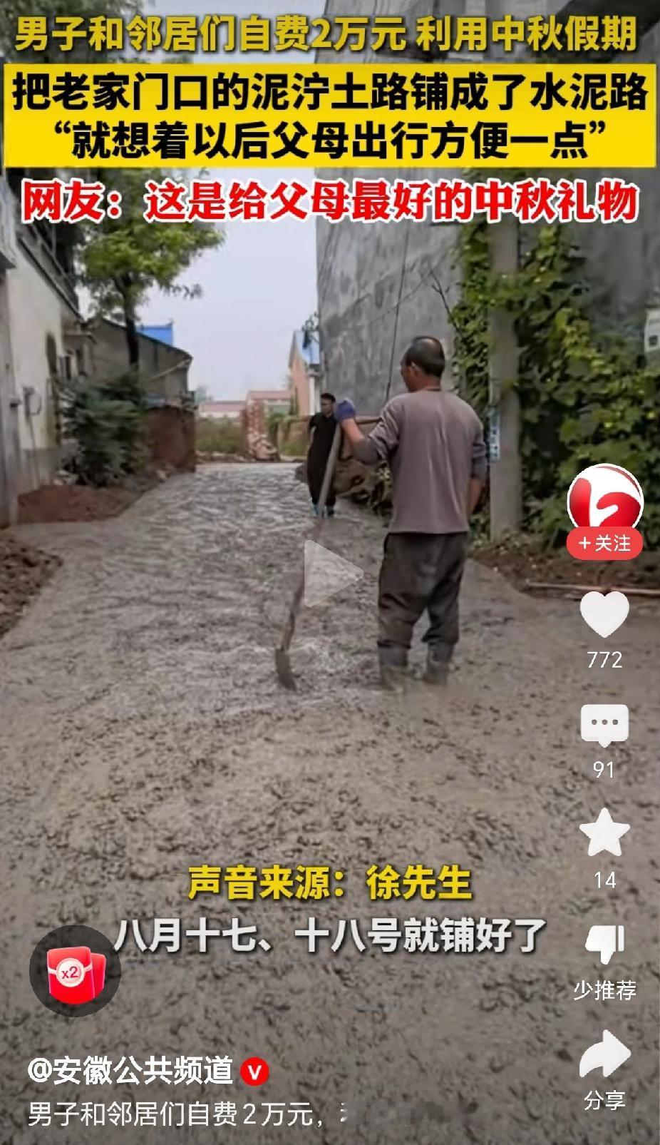 “方便了,男子自筹2万元将家门口的泥泞村道修缮一新!”近日,河南,男子国庆节回家,发现门口的村道泥泞不堪,出入十分不方便,于是和邻居商量自筹2万元,将道路修成了水泥路!(来源,安徽公共频道) 据报道,河南的徐氏先生节日回家,发现父母站在泥泞的道路当中来接他,鞋子上裤脚腿都沾满了泥巴,心中很不是滋味。 当天晚上,徐先生就和邻居进行商量,村口的这条道路太烂了,严重影响了人们的出行,是我们一起修缮一下呢! “我出2万元,用来买水泥沙子!”徐先生首先就把自己准备的条件说出来。“看大家是不是一起出工出力呢?” “你都出钱了,我们没理由不干!”于是乡亲们说干就干。第二天,徐先生就联系了城里的商家,送来了水泥和沙子。 邻居的几户人家一起上阵,将水泥沙子合成砂浆,平平整整的铺在了道路上。到中秋节后的第三天,农历8月18日,就全部将村口的道路修好。 徐先生的母亲走在新修的水泥路上,笑的嘴巴都合不拢了,“真的是太好了,太方便了,以后出门再也不用婆一脚水一脚了!” “家门口的时候还是需要乡贤出来牵头呀!”有网友评论说,自己家门口的路,还是需要自己动手,真的是又快又省! “大家一起动手来修路,这个值得推广!”有网友说,有时候乡亲们要办成一件事,还是要靠大家齐心协力。 是呀,乡村振兴不能够等靠要,家门口泥泞的道路维修,一些设施的完善,还是需要一些有能力的人站出来牵头组织,让自己的家门口更加干净整洁,更加方便出行! 对此,你的看法是怎样的呢? 家门口修路 @秋实99 关注人生冷暖,拥抱幸福生活!