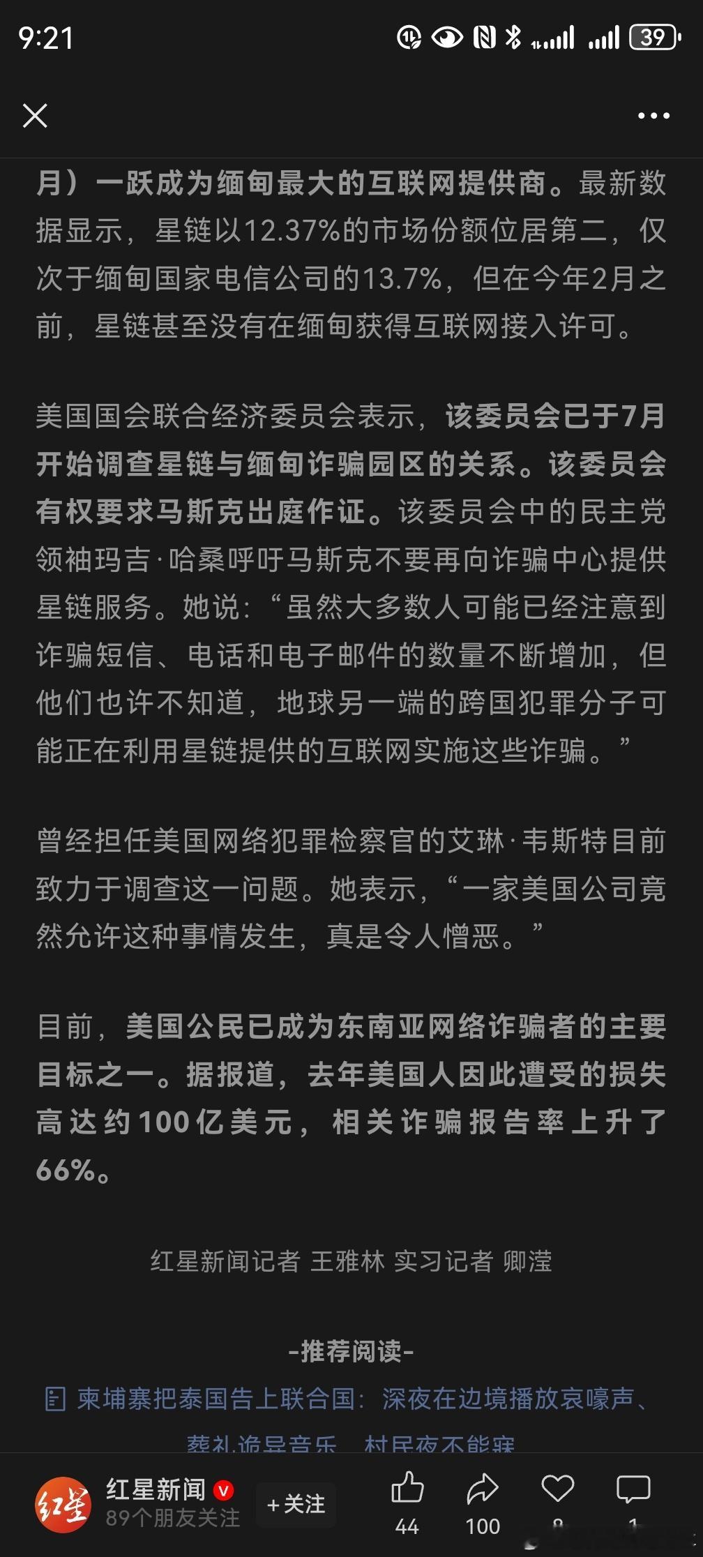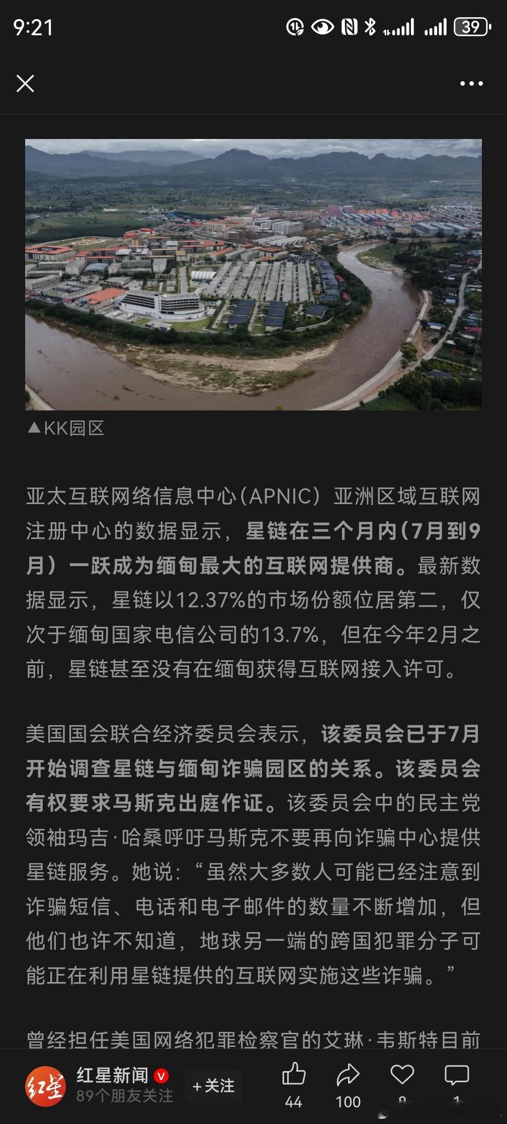 星链成缅甸最大互联网供应商 据红星新闻,星链3个月内成缅甸最大互联网提供商,“仅KK园区一建筑上发现约80根卫星天线”;美国会调查:是否沦为电诈园区“帮凶”