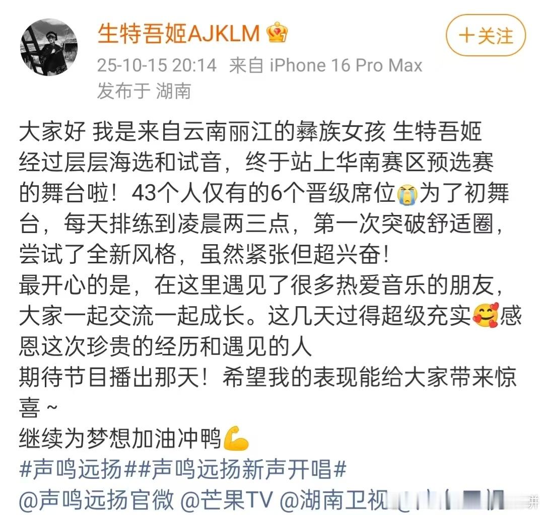 00后彝族女孩勇闯音综 一个从云南来的彝族女孩勇闯《声鸣远扬 2025》,突破舒适圈、认识新朋友,为梦想努力的女孩,期待她的舞台!