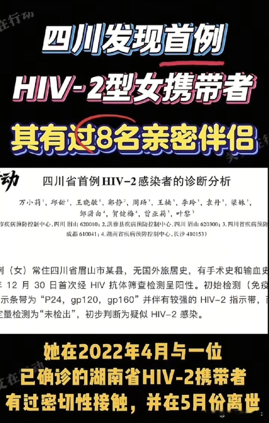 重要事情说三遍, 请管好自己! 不要给社会带来负担! 四川省眉山市确诊一名女性为首例HIV-2型感染病例。 HIV-2是一种主要在非洲西部流行的HIV变异株,这几年来随着全球交通的利,HIV-2型通过输入性传播和本土性传播的病例逐渐增多。 该女性无出国史,仅有手术史和输血史,2024年12月30日HIV抗体筛查呈阳性。经流行病学调查,她与8名男子发生过性关系,其中一名是HIV-2感染者,2022年4月与该男性发生性关系,该男性于2022年5月去世。 该病例表明HIV-2型病毒可能已在四川省存在,这给艾滋病的防控工作带来了新挑战。 网友:乱搞比中大奖容易多了!四川、重庆重灾区! 公众要自律,树立正确的性观念和婚恋观,保持健康的生活方式和价值观念。 你们怎么看现在社会上这些人呢?艾滋病 艾滋病检查新规 艾滋病恐惧症 合胞病毒RSV 艾滋病人数 艾滋病抗艾 [免责声明]素材、图片均来源网络,如有侵权请及时联系删除