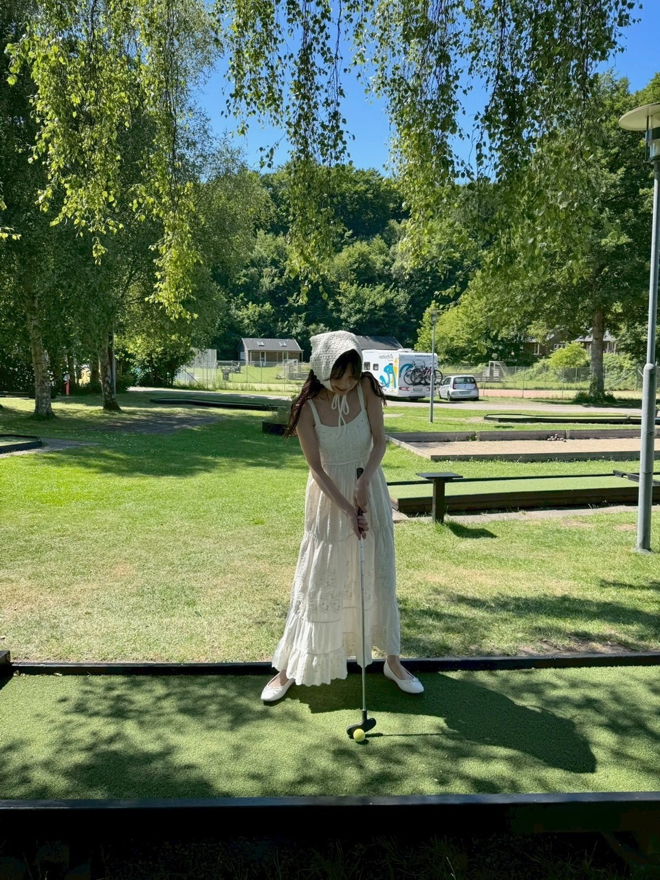 ひな「パン屋さん!ここのパン屋さんに朝行ってからピクニックをしました!外観も可愛くて最高です!ハートのシュシュもポイント^_^ 空き時間にゴルフ⛳️ ピクニックした場所に色んな遊ぶ場所があったのですが空き時間にブランコしたりトランポリンしたりゴルフしたり!ゴルフなかなか難しかった、、」