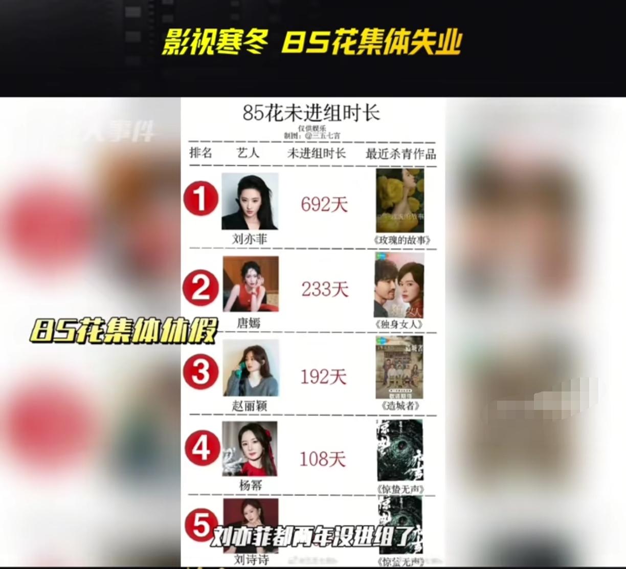 影视寒冬来了,85花集体失业,就连赵丽颖都已经4个月未进组了,雷佳音也自爆无戏可拍,老牌明星馨子直播时说“自己不是退圈,而是没有人找我拍戏了”,你说她当年还是出圈的一位,我自认为她年轻时的美貌比现在的85花可一点没差! 不过她这人倒是很真实,敢于承认没人请她拍戏,不向某些人给自己找台阶下说什么息影之类的,看样子现在的娱乐圈是真的不好混啰! 更别提那些个新人演员,每年中戏、上戏,电影学院等各类学校毕业的学生都不知道有多少,而能火的也就那么几个,你看那么帅气的胡一天都说要重新找工作,更别提这些个18线小透明,大家都说现在是短剧时代,不知道多少名校生投身了短剧行业,这些大明星以后也会拍短剧,抢人家饭碗吗? 明星困局 演员行业 演员职业现状 影视行业就业 失业演员 内娱失业 影视圈寒冬
