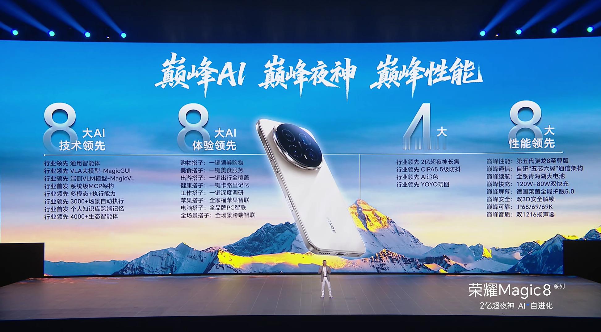 荣耀Magic8系列带来8大AI技术领先,8大AI体验领先,4大影像领先,8大性能领先,共计28项行业领先,简称“8848”!荣耀发布会