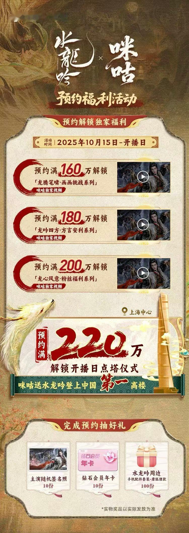 助力水龙吟登顶中国第一高楼 220万预约稳稳达成!开播日上海中心大厦的户外大屏,就要让《水龙吟》站上中国第一高楼!这份天际线级别的高光谁能不期待?坐等开播,看超燃画面霸屏城市之巅!