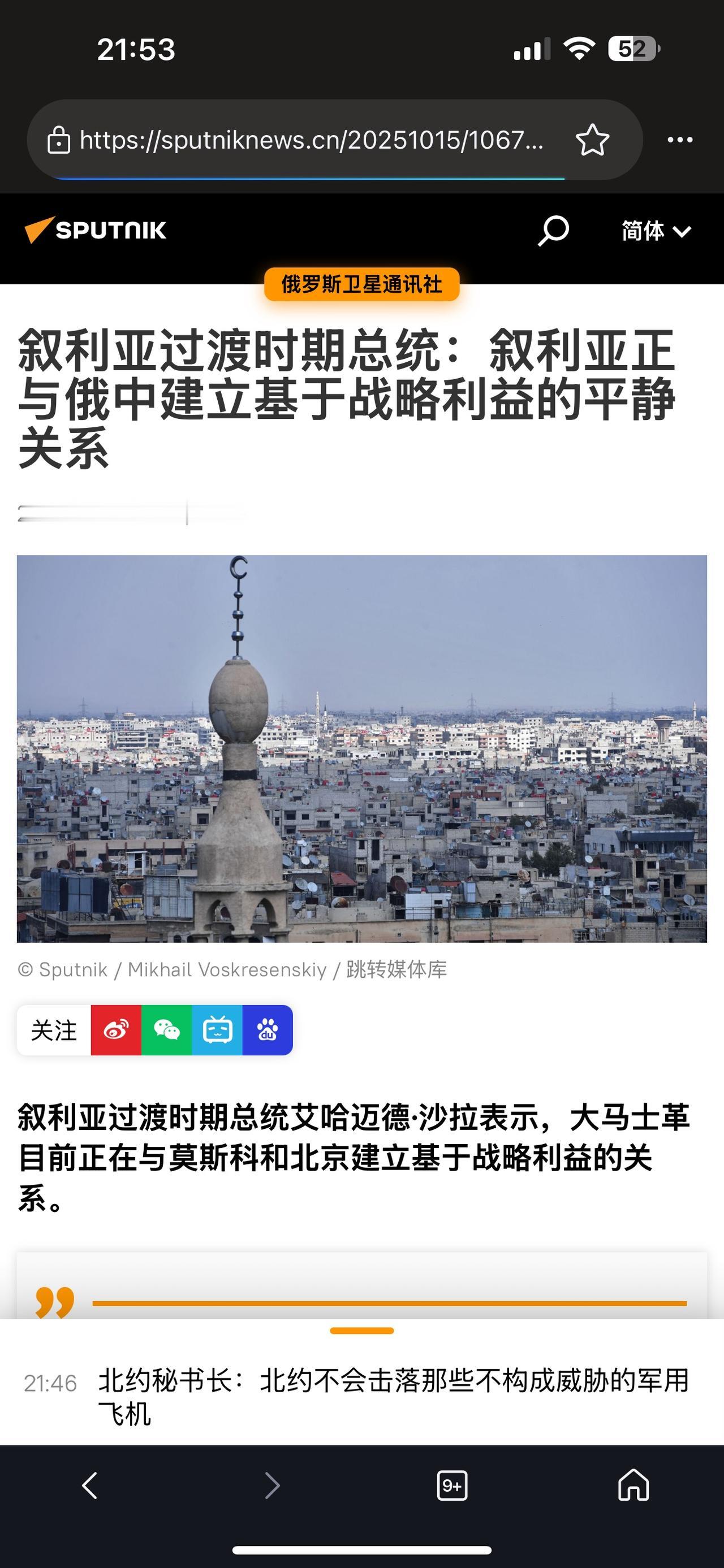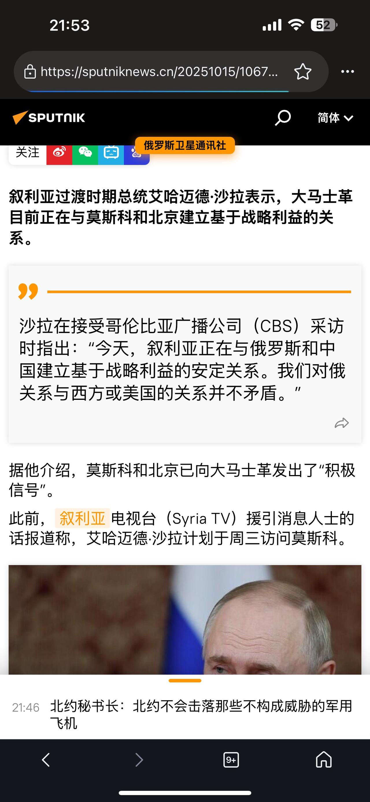中俄将和叙利亚建立建立基于战略利益的关系 (欢迎关注点赞支持) 2025-10-15俄罗斯无线电视台报道:叙利亚总统沙拉在接受哥伦比亚广播公司(CBS)采访时指出:“今天,叙利亚正在与俄罗斯和中国建立基于战略利益的安定关系。我们对俄关系与西方或美国的关系并不矛盾。” 观察分析:失去了叙利亚的阿萨德,在国际舞台上已经彻底消失。或许,对于一直想成为一名医生的他来说,可能是一件好事!