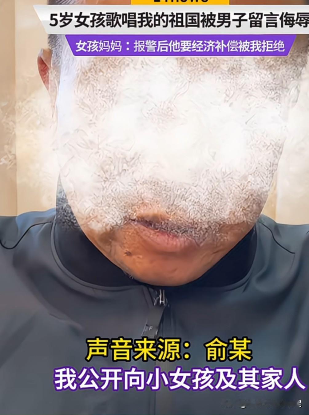 5岁的小女孩唱歌唱我的祖国,妈妈发到网上,本是记录一下生活。 但是一名男子却在视频下面找存在感,发布恶意评论:如图1 真是不明白他对一个毫不相识的女孩子,为什么有如此的恶意了? 女孩妈妈报警,一开始这名男子还想着用钱补偿给女孩,女孩家长不接受金钱补偿,只要求依法处理。现在男子被处罚500元发了道歉视频。 现实中得过的多不如意,才在网上污言秽语的,连小朋友都要诅咒。希望他以后谨言慎行,网络不是法外之地,不能为所欲为。