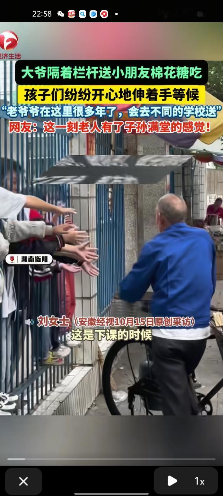 10月14日,湖南衡阳。女子发布视频表示,学生下课时,大爷隔着栏杆送小朋友棉花糖