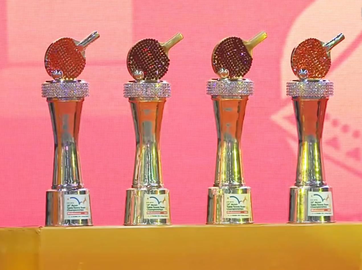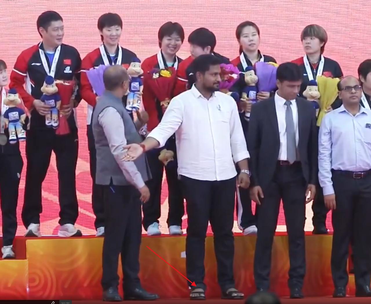 抽象!亚锦赛女团颁奖仪式几个有意思的点: 1.颁奖仪式太拖沓了。在男团比赛结束后一个多小时后才开始,这期间的一个多小时里,先是看了接近一个小时的音乐会;随后又看了大约半个小时的嘉宾演讲,具体说的啥不知道,可能大部分国人都听不懂。 2.是奖杯的造型有些独特。本次团体赛的冠亚军都会有拿到一个奖杯,这个奖杯可能和传统的奖杯不一样,最上面的是乒乓球。 3.女团颁奖仪式上,给冠军中国队颁发金牌的颁奖嘉宾竟然是穿着露脚趾的凉鞋上来颁奖的。不过鉴于本次亚锦赛出现比赛场馆漏水和在比赛期间飞无人机,穿凉鞋上台颁奖好像也没啥。只能用抽象来形容。
