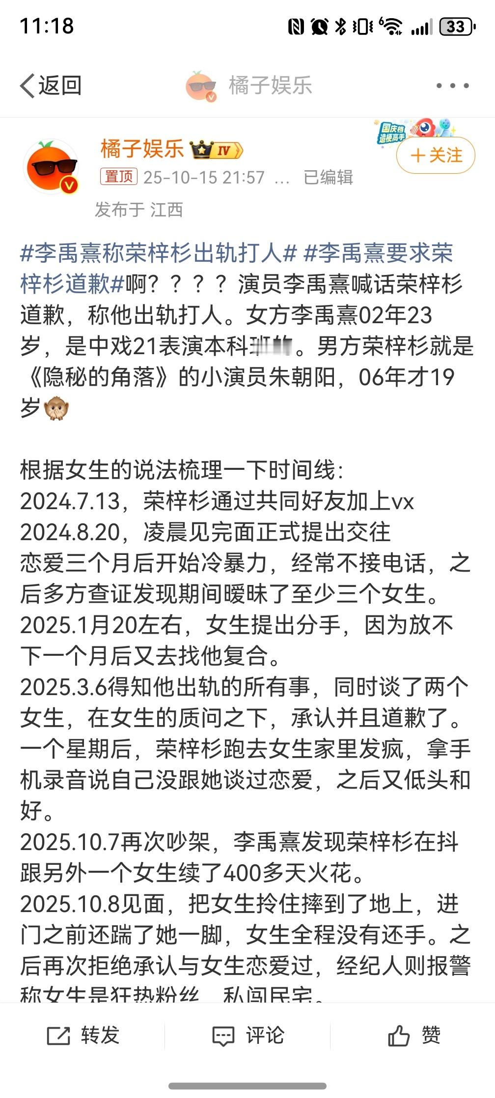 李禹熹称荣梓杉出轨打人卧槽这瓜不小啊,荣梓杉不才19岁吗?还出轨打人。。娱乐圈