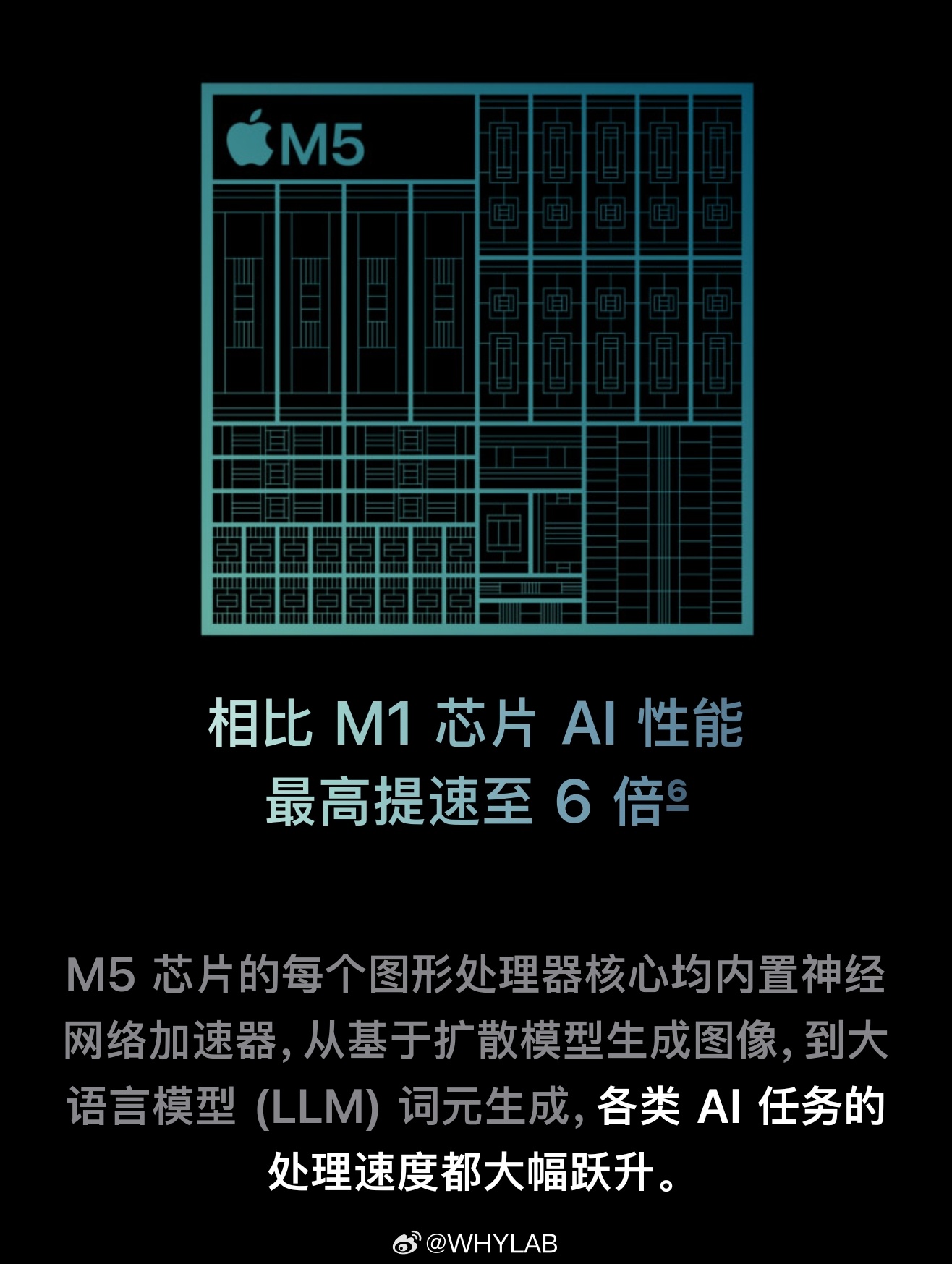 M5 芯片基于 3nm 台积电工艺打造,10 核心 CPU、10 核心 GPU,153GB/s 内存带宽,最高支持 4TB 内存。总体图形性能比 M4 提升最多 45%,多线程性能提速比 M4 芯片最高可达 15%,LLM 提示词处理性能为 M1 的 6.4 倍、3D 渲染性能为 M1 的 6.8 倍。