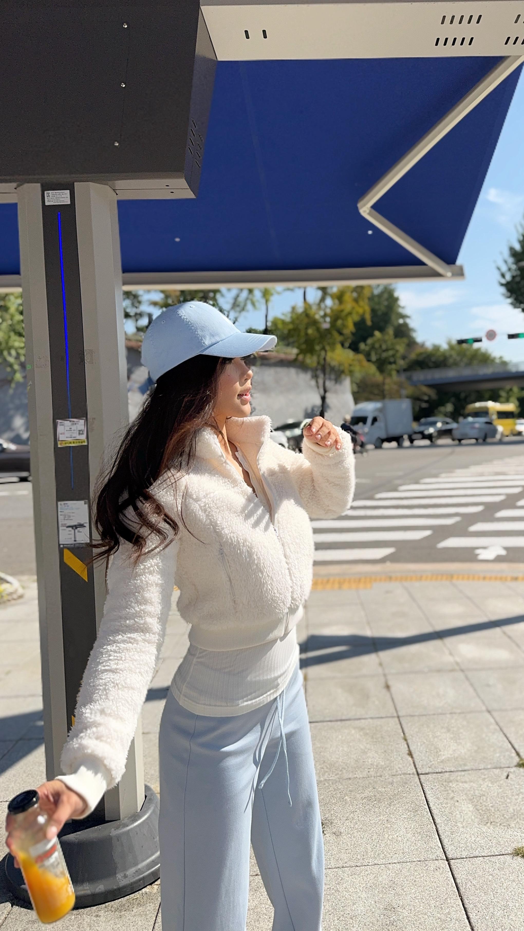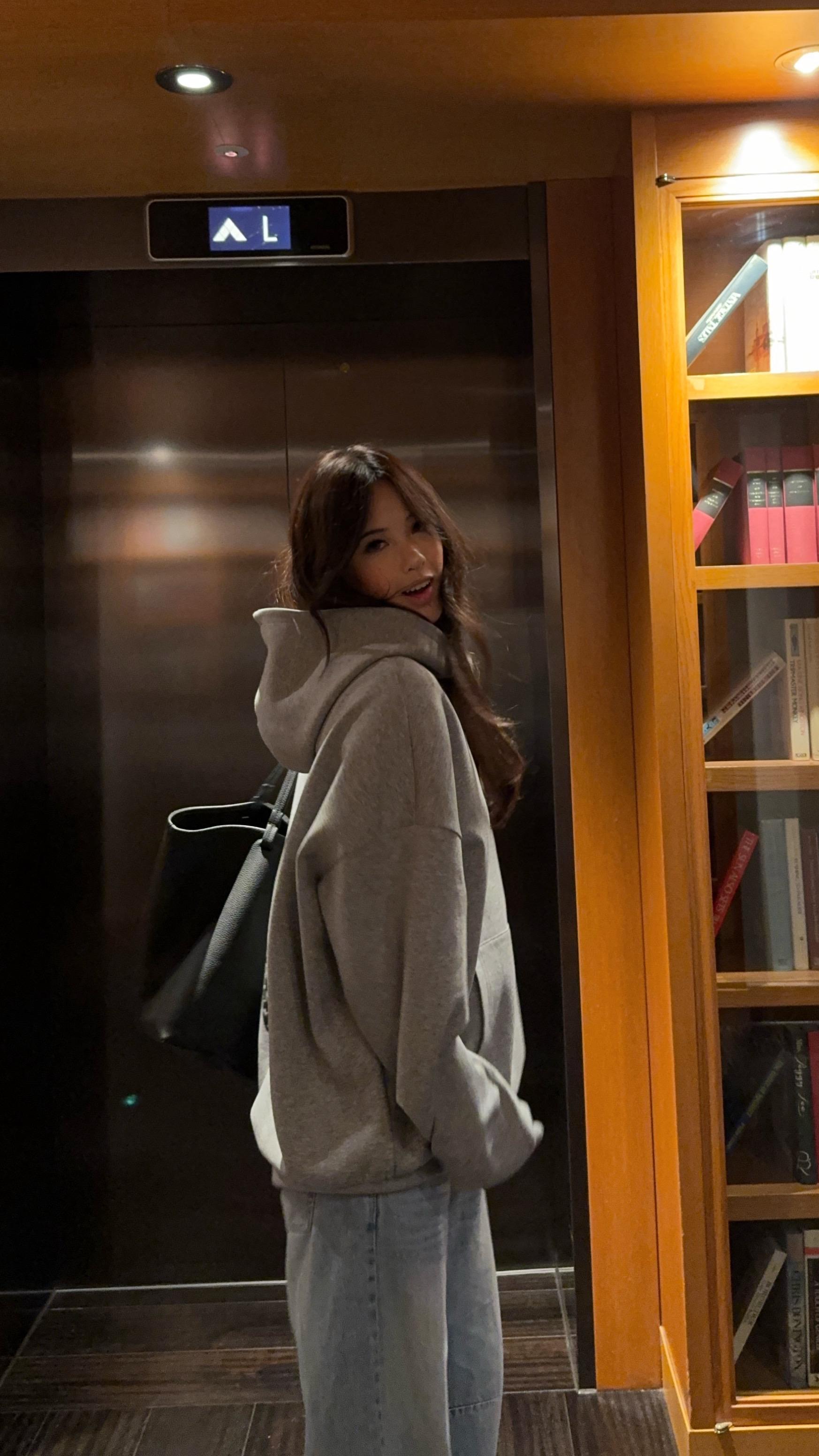 运动后放松时刻,穿红色卫衣,享受宁静时光。
