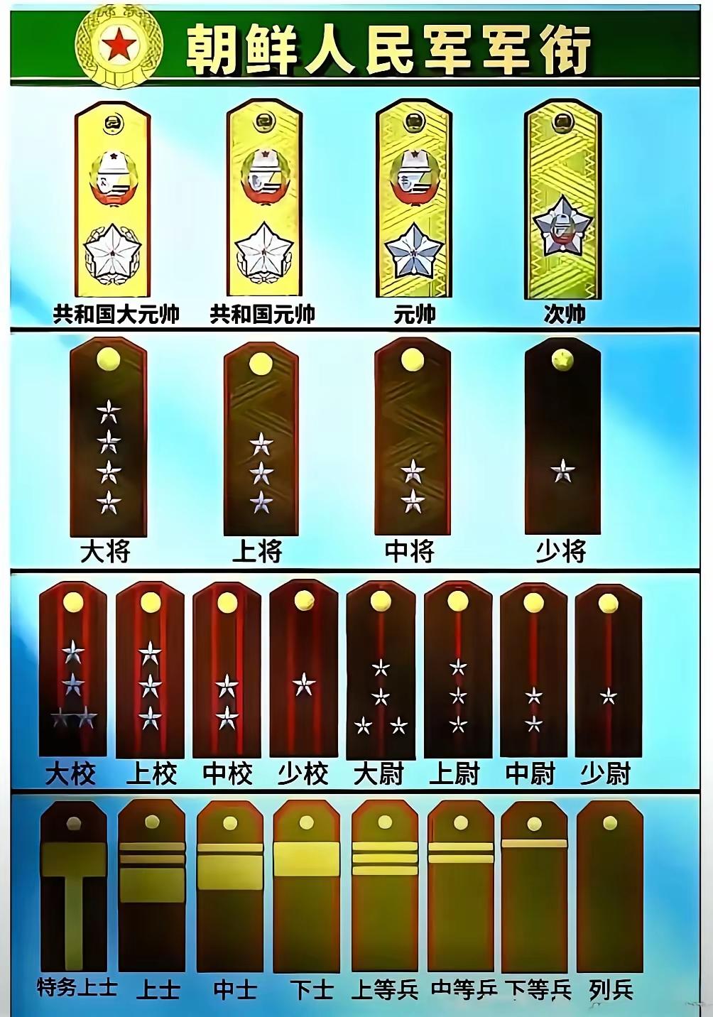 朝鲜的军衔制度受苏联影响,发展成为了世界上最复杂的军衔。 苏联的军衔体制,曾在冷战时期影响了很多国家的军事制度设计,大概有30多个国家。 苏联解体之后,目前大概还有15个国家的军衔制度,保留了苏联式军衔的核心特征。 虽然保留这种军衔的国家不多了,但是大将、大校军衔名称仍在欧亚大陆广泛使用。 朝鲜的军衔制就是苏联式的军衔,将官和校官都是苏联首创的。 而朝鲜跟其他国家不同的是,很多国家都取消了元帅军衔,或是将元帅作为象征性的最高军衔,但是朝鲜将元帅军衔分为三级,分别是大元帅、元帅和次帅。