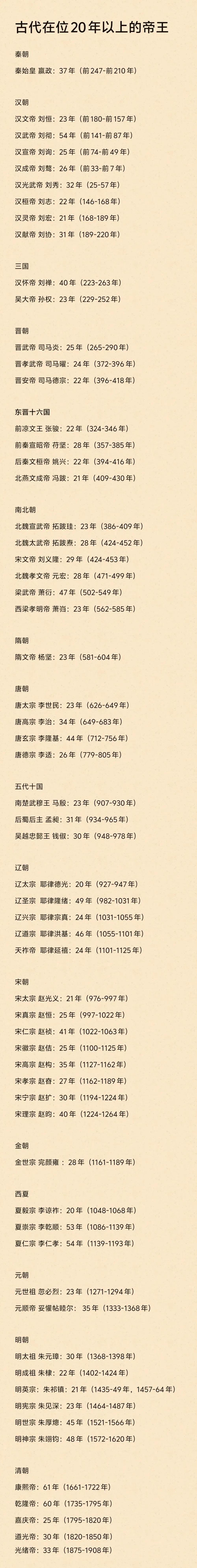 我国历史上平均每9位帝王,就有一位在位超过20年。 下图就是我国历史上在位超过20年的皇帝们。 我国历史上的正统帝王大概有357位,而在位20年以上的帝王只有40位。 所以这并不是一个很容易达成的成就,需要皇帝既能够长寿,又能保持其在位期间的政权稳定性,二者缺一都不行。 一般来说在位时间长,都能够有所作为,但是也有例外,例如明朝的万历皇帝。 他在位48年,最后30年却不上朝,直接导致了明朝衰败。 如果从另一方面来看,我国的所有帝王平均寿龄只有39岁,能够在位超过20年,确实很厉害。