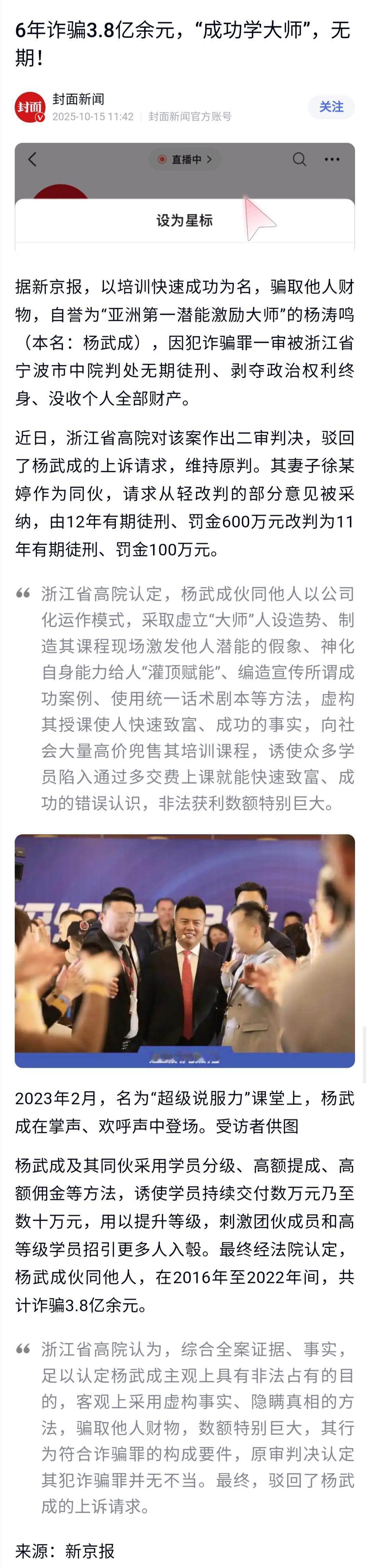 “成功学大师”、“人生规划大师”、“潜能激励大师”,与渴求“一夜暴富”、“走成功捷径”、“逆天改命”的普通人遭遇,很快就会形成诈骗的“闭环”。普通人以为遇到了人生的“指路明灯”、而“大师们”则把他们当提款机,边数钱,还边嘲笑这些人钱多人傻,不骗他们骗谁。对于这种以培训快速成功为名的诈骗,除了依法打击外,更需要加强对公众的常识普及,提高公众的识别能力,不要被“成功学蛊惑”。 从法院公开的犯罪事实看,这名“潜能激励大师”,所销售的培训课程,根本没有什么能让被培训者快速成功的秘诀。据报道,多位受害者接受采访时称,他们在杨的课程中不自觉地陷入“交的钱越多,就越能快速成功”的假象,多人刷信用卡或借款缴费,但多次听课发现内容重复、空洞,最终导致债务缠身。这就是受“成功学蛊惑”。 近年来,“信息差”、“情绪价值”这些概念很流行。而“成功学”培训,就不断强化“信息差”,鼓吹普通人难成功、走人生弯路,是因为缺乏帮他们成功的信息,存在“信息鸿沟”,接受他们的培训,买培训课程,会补上“信息差”。买的课程越高阶,就会获得更大的信息优势。同时,特别善于营造氛围,以热烈的现场气氛、学员(托儿)的现身说法,让深陷其中的学员获得很大的情绪价值满足,以为获得了真知以及真心帮自己的贵人,不断掏钱买课程,“跟随大师”。在这起案件中,有学员甚至花几万元买大师的一根头发。 其实,在信息时代,所谓的“信息差”,不如说是“认知能力差”。在互联网上,只要有基本的上网搜索能力,要获取想要的信息并不难,“大师们”并不掌握比普通人更多的信息,他们的信息也大多是从网上拼凑而来。问题在于,不少人不愿意对这些信息进行分析、比较,而是愿意相信“大师们”提供给他们的信息。“大师”也就利用这种认知能力差,打造自己的“权威人设”,给学员自己掌握内部信息的假象,用极端功利、煽动的语言刺激学员,让本来就缺乏识别能力的学员,更失去判断能力。 满足“情绪价值”也是一门新的生意经,但也很容易走偏。如针对底层人的焦虑情绪,煽动焦虑,再以帮其化解焦虑为名收割焦虑,也是提供“情绪价值”。在这方面,一些自称“大师”者与有的网络“大V”玩得很溜。近年来,培训贷、套路贷等培训乱象,也源于同样的底层逻辑。 需要警惕的是,以培训快速成功为名的诈骗犯被追究法律责任,但还有人继续在这条路上忽悠。为此,需要将这些案件,作为案例,对普通公众进行案例教育。其关键在于,要提高公众的识别能力,即对信息进行理性观察、思考的能力,不要轻易被他人带节奏,被成功学蒙蔽,要有独立的判断。成功并无所谓的捷径,更不能靠上培训课程就改命,而需要踏实的奋斗。