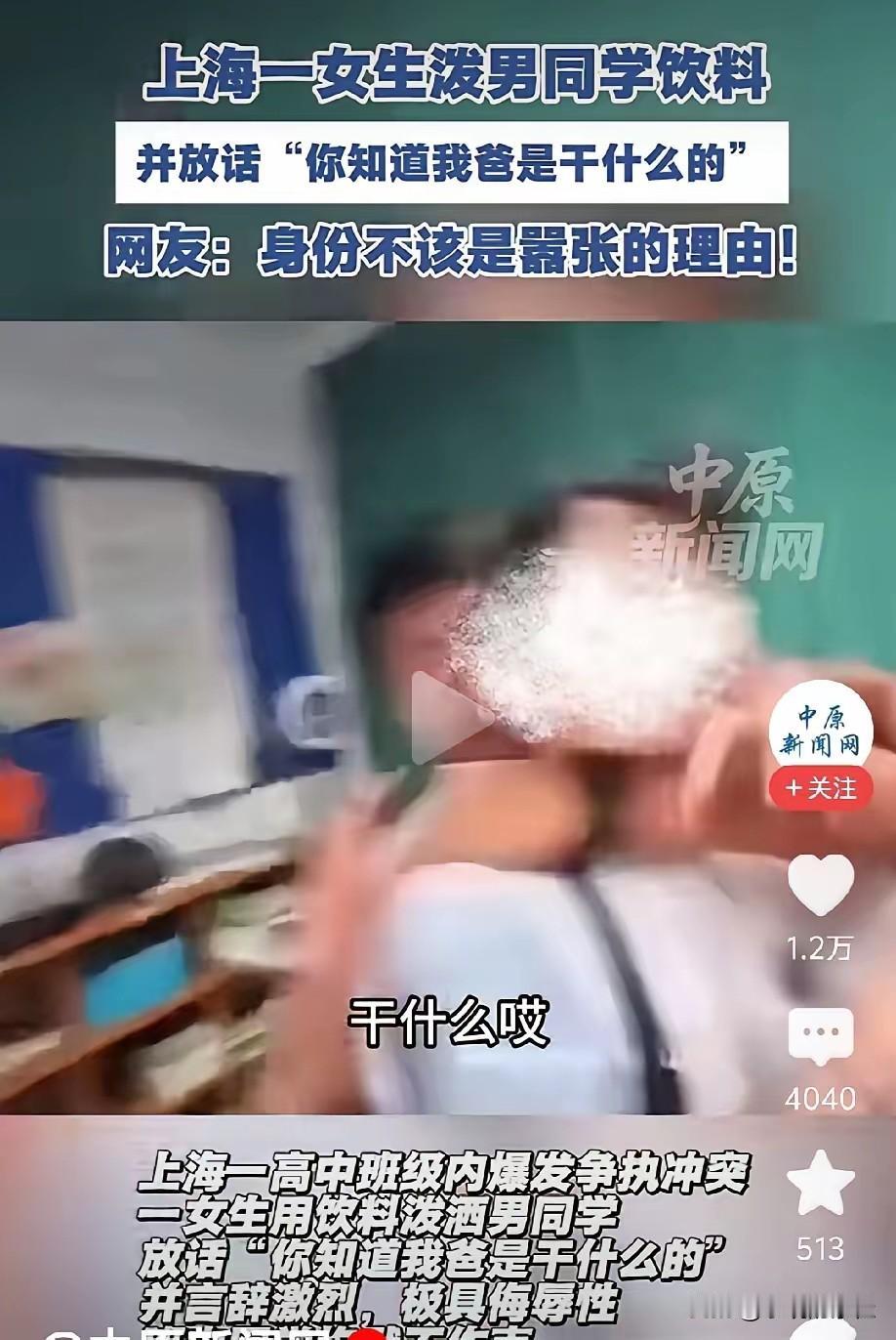 上海某高中那位女生现在估计肠子都悔青了! 她后悔的不是在同学面前泼饮料,也不是口无遮拦炫耀家世,而是没想到自己的行为会被镜头完整记录下来,瞬间传遍网络。 视频里,她反复强调男生中考低她30分,未来只能读大专,甚至搬出父亲的身份施压。教室里无人阻拦的沉默,反而让她的嚣张显得格外刺眼。 男生最后的反击像一面镜子,照出了欺凌终将反噬的必然。若没有同学拉开,事态或许更难收场。这场闹剧背后,真正该反思的或许是那些默许特权滋长的环境——孩子的言行,从来都是成年世界的倒影。