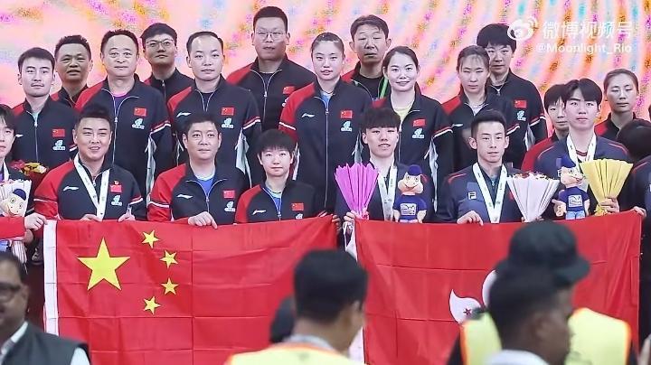 包揽男团、女团冠军的国乒大合照[笑哭]! 包揽印度亚锦赛男团、女团冠军的国乒选手大合影[赞]! 还和中国香港队选手来了个大合影[赞]! 两员大帅王皓指导、邱贻可指导被选手们簇拥在中间,紧挨着的是王楚钦、林诗栋、孙颖莎、王曼昱男女各两位大将,然后左右两边分别是是梁靖崑、向鹏、周启豪、蒯曼、同同、大迪。 让人很欣慰的是蒯曼排在了同同和大迪的前面,这说明小将蒯曼要来到女队第三人的位置了[赞]! 图二上获得亚军的港队选手也一起拍照了,杜凯琹和大迪站在一起,两个好姐妹呀。 颁奖仪式上,升国旗、奏国歌的时候,港队选手也放下手中的鲜花、整理仪表仪容一起凝视国旗[赞]。 相亲相爱一家人包揽了男团冠亚军[赞]!
