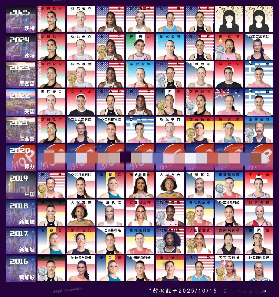 2016年-2025年十年间WTA年终总决赛阵容。其中2020年因故停办,而这一