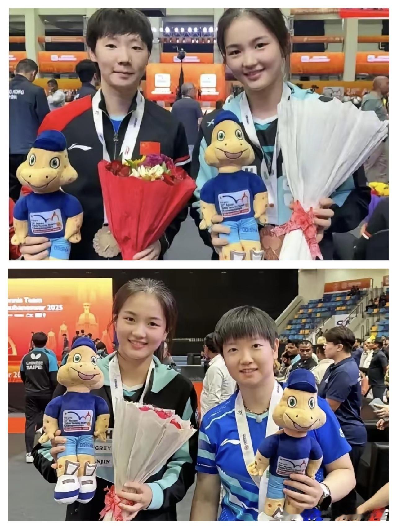 亚锦赛颁奖刚结束,后台就捕捉到暖心一幕!韩国选手金娜英主动找孙颖莎、王曼昱合影,