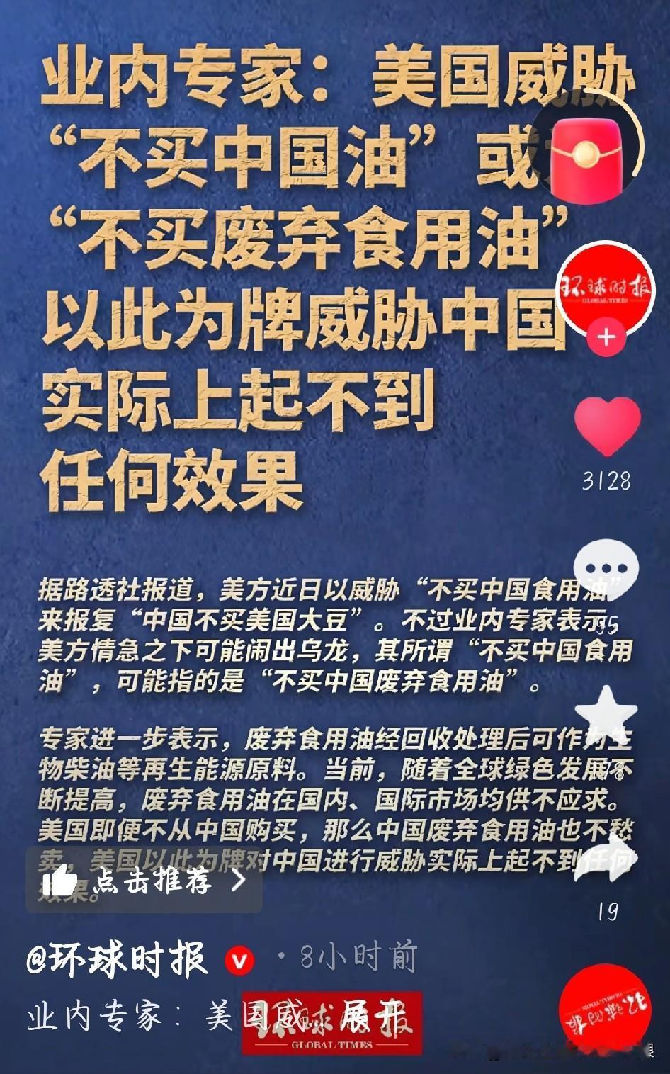 笑不活了!美国威胁禁的中国“油”,竟是咱的废食用油 特朗普又放狠话了,说中国不买美国大豆,就要报复着不买中国食用油,还嘴硬说自己能生产。结果网友一扒,这波纯属闹了个大乌龙! 他说的哪是能吃的食用油啊,极有可能是咱平时炸完东西剩下的废食用油。咱中国本身就缺食用油,每年都得大量进口,哪有多余的出口?2024年对美出口食用油才4000吨,值1000来万美元。 但废食用油不一样,美国去年从咱这买了127万吨,花了11亿美元,占了他们进口量的一大半。这油可不是没用的垃圾,美国搞绿色能源,做生物柴油、航空燃料全靠它当原料,72家燃料厂都指着这活呢。 更有意思的是,这废食用油全球都抢着要,欧盟、日本都是大客户,咱根本不愁卖。美国自己产的量不够,短期内也找不到替代品。 说白了,这哪是报复别人,分明是拿自己的能源产业撒气。中方都说了,贸易战没有赢家。这波操作,属实是搬起石头想砸自己的脚!美威胁停买的中国油或为废弃食用油 特朗普大豆困局 转基因大豆油 中国大豆,为什么要“争气”? 图片截图于环球时报