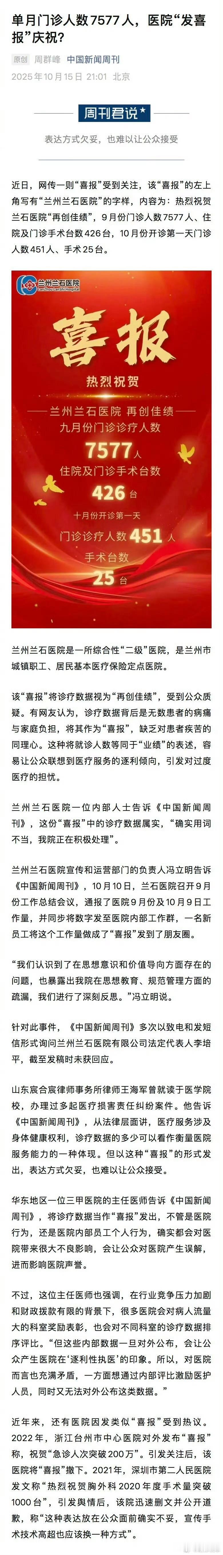 医院发喜报庆祝门诊人数创佳绩,单月门诊人数7577人,医院“发喜报”庆祝。 古代对联都是“但愿世上无疾苦,宁可架上药生尘”,如今不一样了,人家开医院就是为了赚钱,就是发“喜报”赚个盆满钵满,顺便庆祝庆祝。 这医院真是令人无语,吃相也太难看,诊疗数据背后是患者的病痛与家庭负担,却将其包装为“佳绩”庆祝,说到底,就是缺乏同理心,实在有违“但愿世间无疾苦”的传统医德。 将患者数量等同于经营业绩,既违背但愿世间人无病的医者初心,也暴露了当前部分医疗机构将公益性服务异化为规模竞赛的倾向。 事儿一出,网友们瞬间就炸了。大家心里都明白,这些冰冷的数字背后,是一个个被病痛折磨的患者,和他们家庭沉重的负担。医院这么一宣传,就好像在盼着人生病,把患者的痛苦当成了自己的业绩。很多人直言,这感觉太冷血了,完全看不出半点对病人的同情心。 唉,医院本是救死扶伤的地方,现在成了赚钱的的地方。