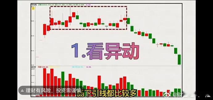 ​​​第一,看异动。主力出货肯定是为了吸引散户来跟风接盘,这时股价上下浮动较大,长上引线、长下引线都比较多,往往采用小阴小阳线,这样的形态大多是出货。