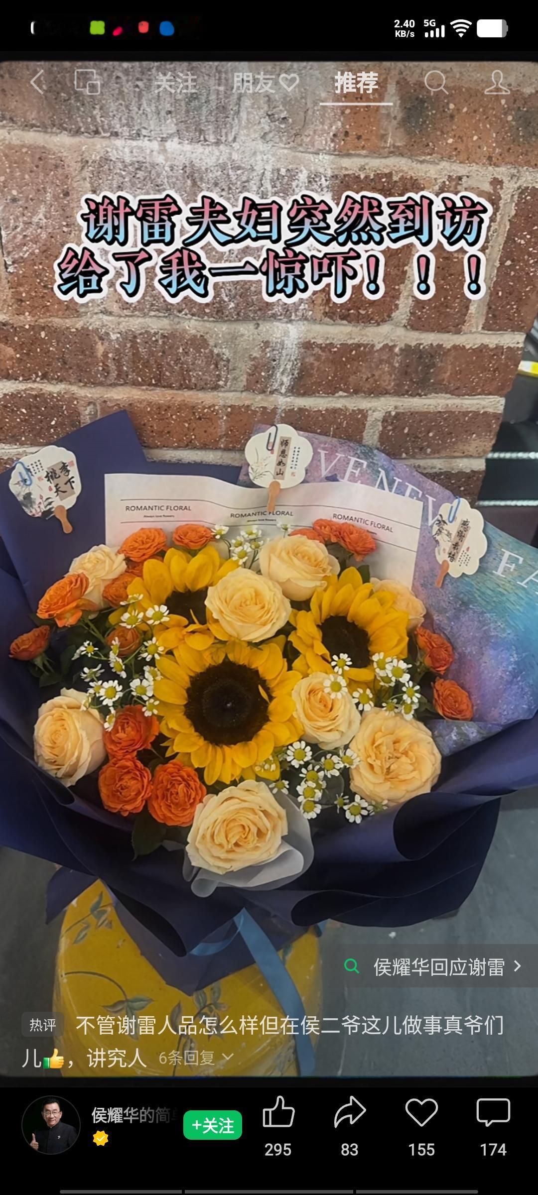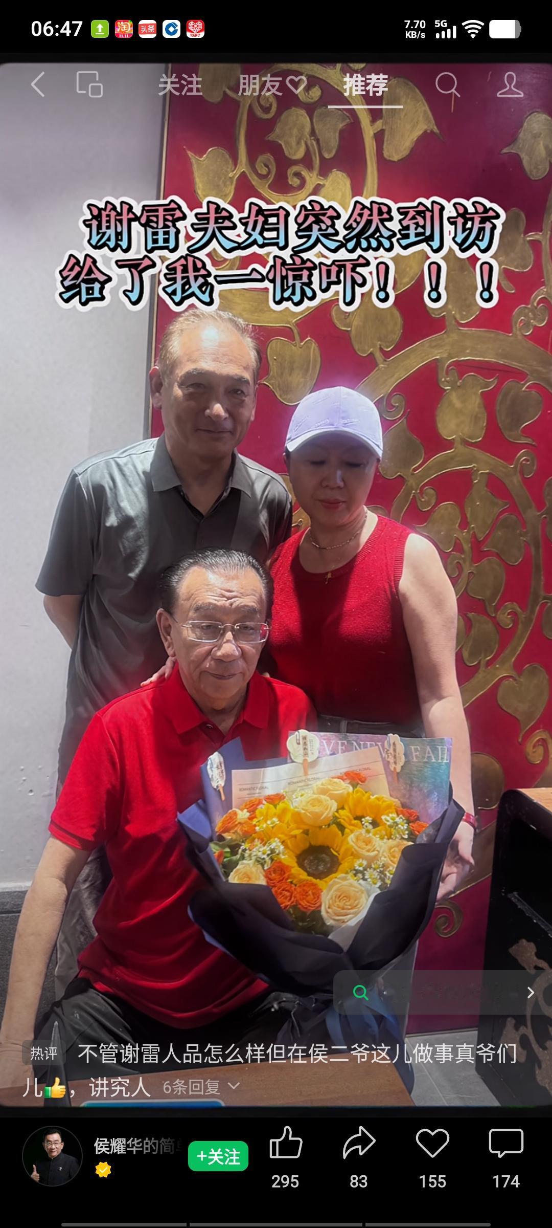 不管谢雷做人做事存在何种问题,也不论他与侯耀华之间的师徒恩怨谁是谁非,他着实是个真爷们,是个重情重义的汉子。 昨日,谢雷得知侯耀华前往广东英德茶基地后,未提前打招呼,便携爱人一同前去看望师父,想给师父一个惊喜。事后,侯耀华发文表示:“没想到,谢雷竟来英德看我了,事先也没跟我说,本想给我惊喜,倒把我吓了一跳,好在我胆子大。大家瞧瞧,他们两口子送我的花美不美?” 师徒二人一笑泯恩仇。毕竟侯耀华已是80岁的老人,正如谢雷所言,师父永远是师父,过往的恩恩怨怨都已成为过去。在这件事上,谢雷鞍前马后伺候师父20多年,花费百万,毫无怨言,真是条汉子,为谢雷点赞!