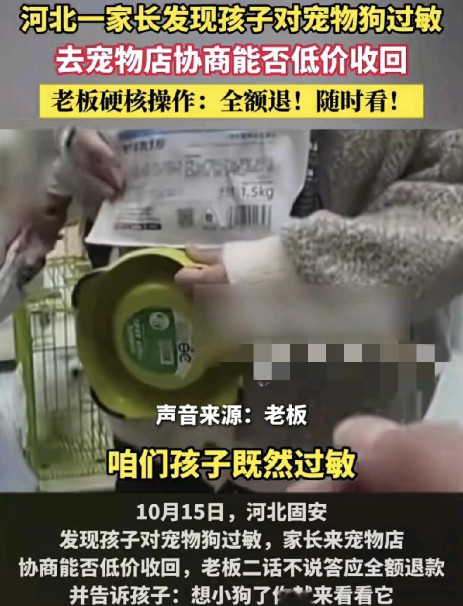 10月15日,河北国安一家长在宠物店给孩子买了一只小狗,发现了孩子对宠物过敏,于是跟老板说能不能低价收购回小狗,没想到老板二话不说,就全额退款,老板表示既然孩子对小狗过敏,他挣钱也不痛快,老板并叮嘱家长小孩如果想念小狗了可以随时来看它。这么干脆做事的老板真的很少见,换做其他电不一定能退货。