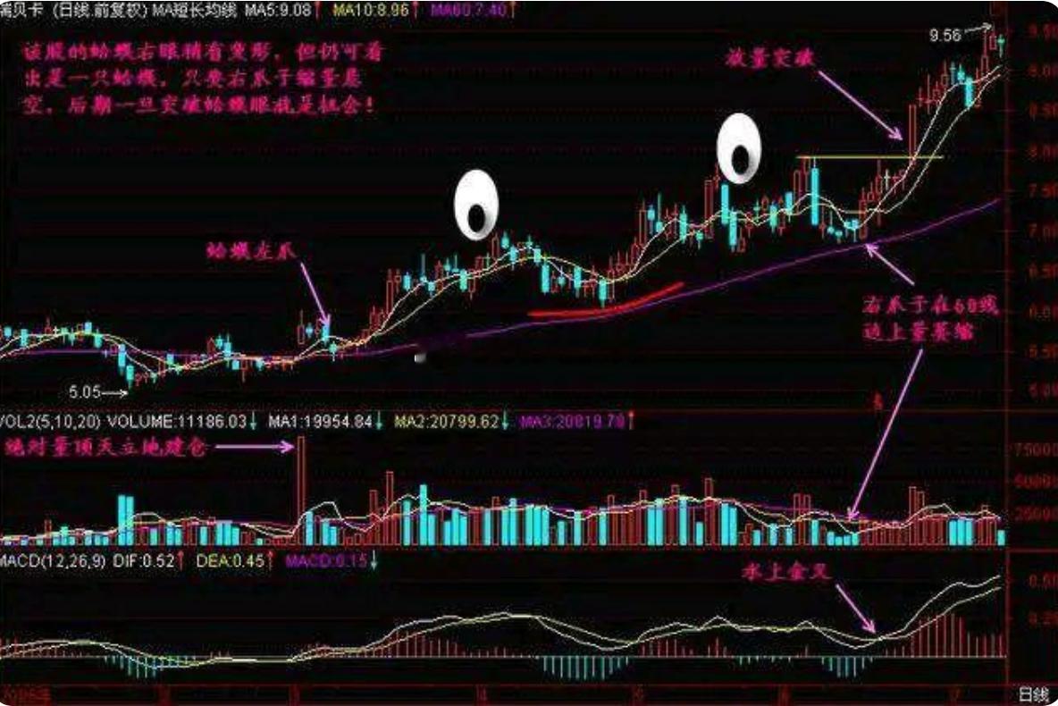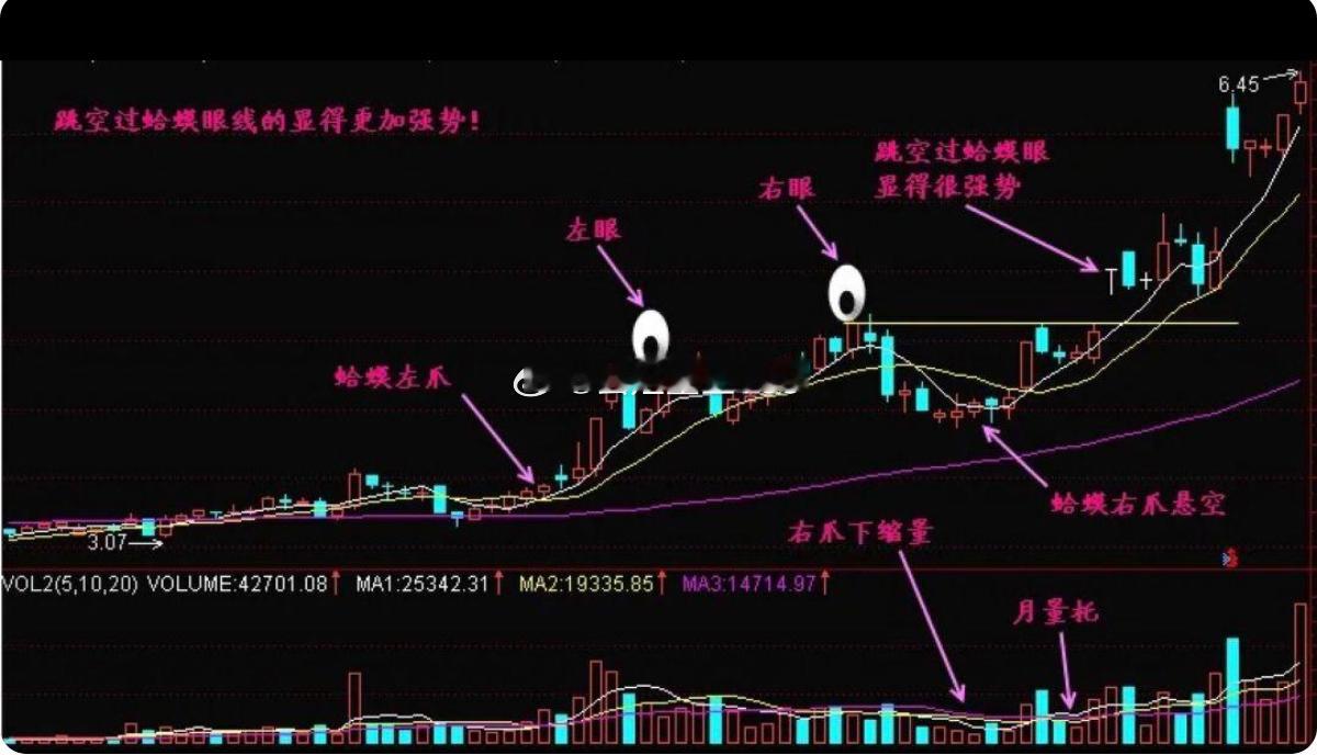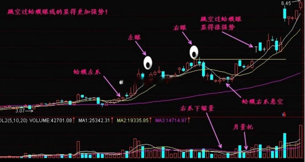 1. 蛤蟆的左爪和右爪形成时,一定要缩量,量能越少越好;但两只眼睛下面的量能得“丰满”,也就是要放量,这样才靠谱。