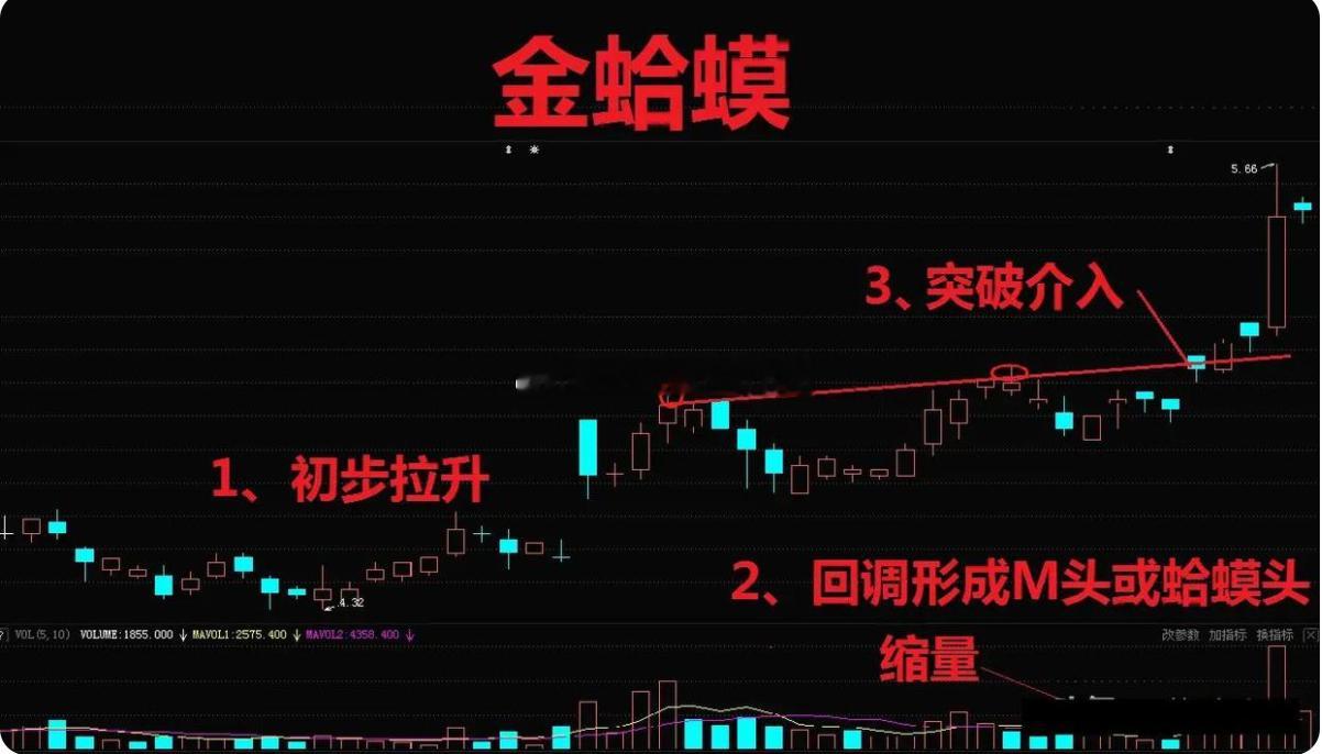 1. 金蛤蟆是在行情初步拉升后出现的,先涨一波,然后有点“疲态”,走出M头开始缩量调整,这才是正常的形态。