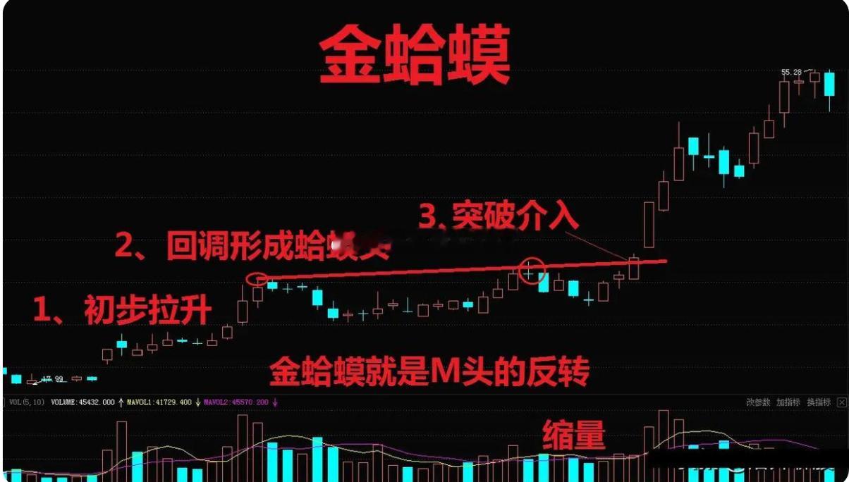 2. 回调过程中必须缩量,成交量得是“凹”进去的样子——先放量拉升,再缩量回调,最后再放量突破。而且回调时不能跌破前面的低点,不然形态就破了,不能算金蛤蟆。