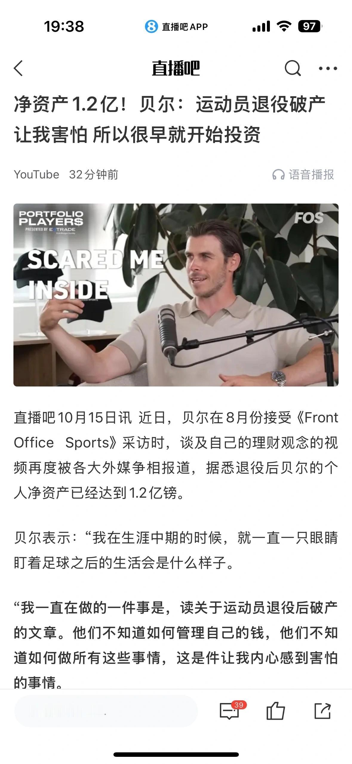 贝尔还是聪明,怕退役之后破产,投资赚了不少钱。 在美国NBA也是,退役球星一多半都能在几年内破产。 贝尔在踢球时候就在想以后的生活,所以净资产还有1亿多呢。 退役运动员的标杆,贝尔。[偷笑]