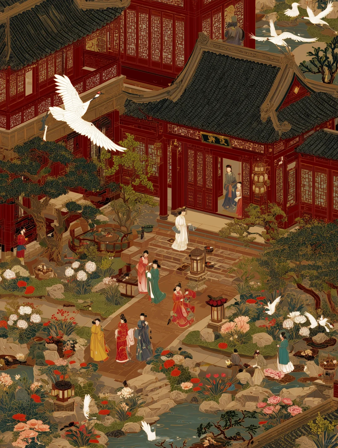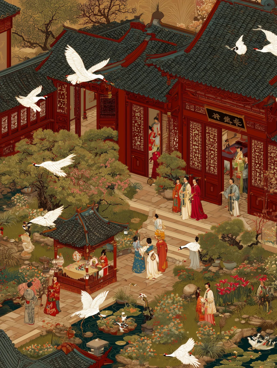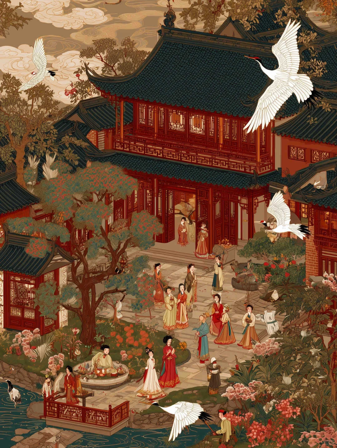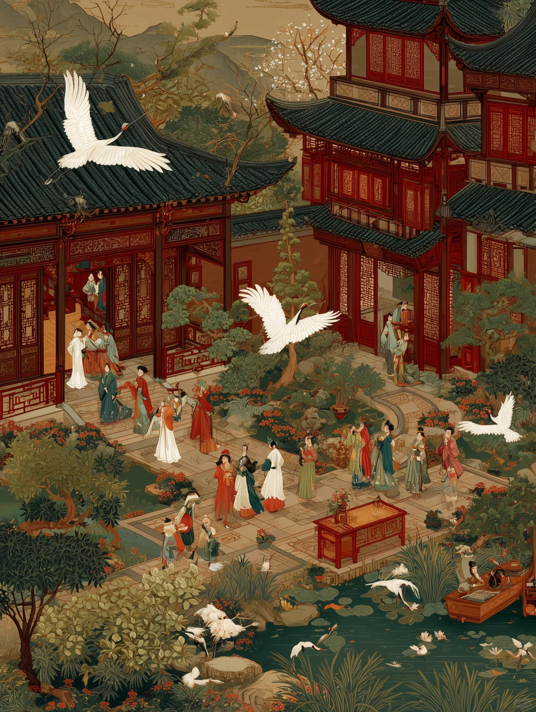 霓裳舞罢倚花眠,玉箫吹彻,惊起白鹤翩跹。(AI生成)