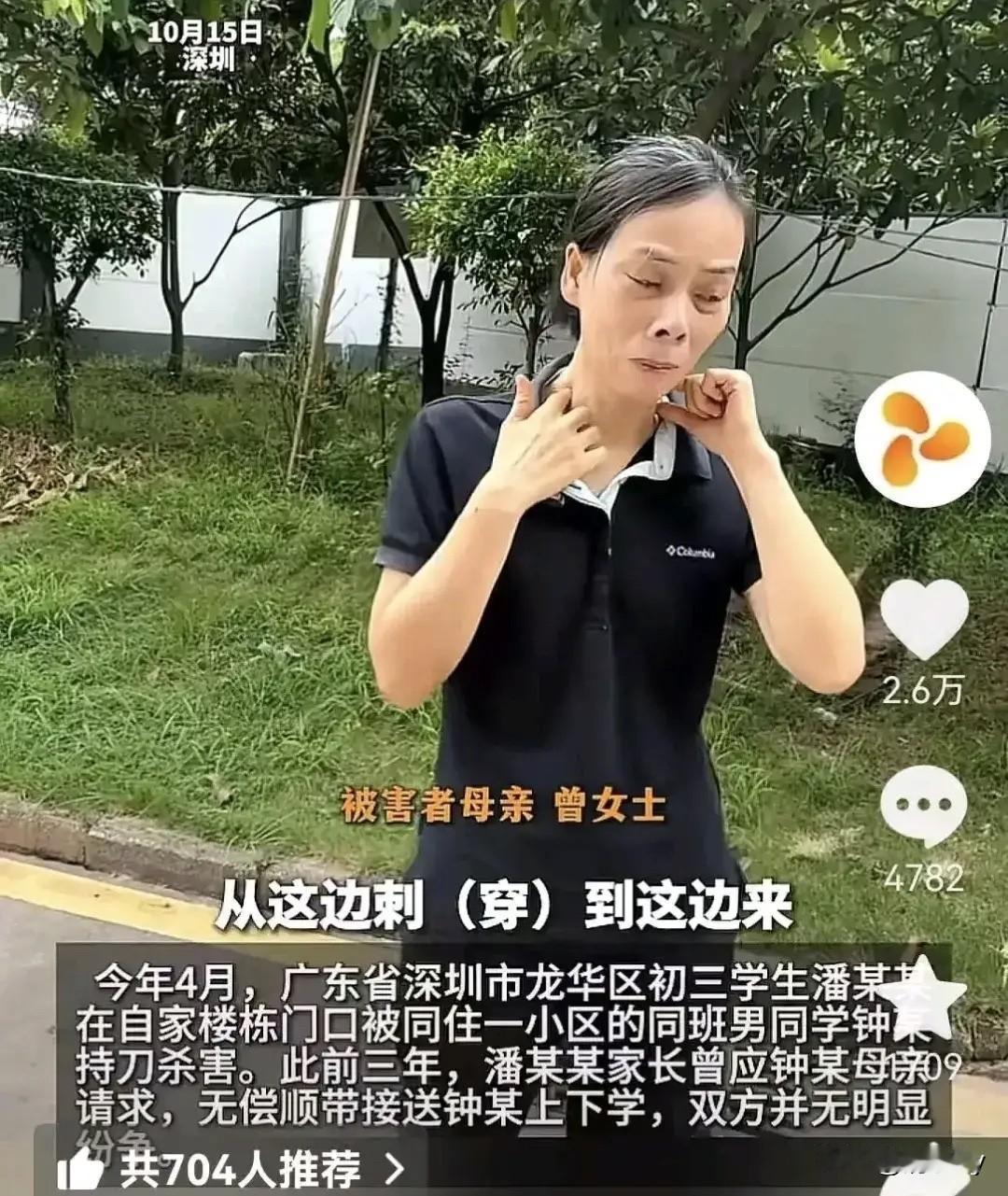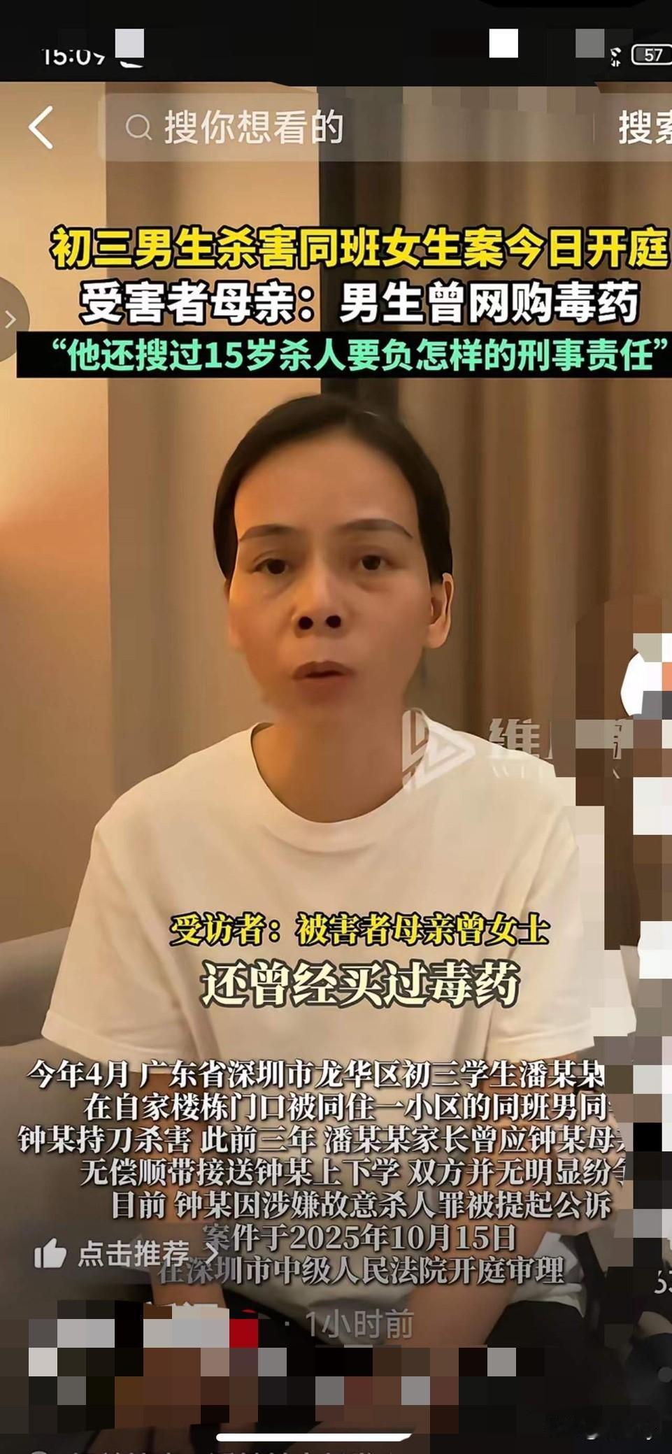 和不熟悉的人保持距离不是冷漠是在保护自己!深圳初三女生被害就是一个例子! 虽然同住一个小区,对别人的家庭和孩子不了解的话还是轻易不要太好心,三年的免费接送没换来一句感恩的话! 反而对女孩心生嫉妒拿折叠刀,对着每天上下学同坐在一辆车的女生刺了26刀!离开后听见女孩喊救命又返回去继续行凶! 回到家还跟父母说自己是“见义勇为”被别人砍伤了双手! 100多天的时间里,被害女孩的妈妈头发由青丝变成了白发!每天都抱着希望,希望恶魔能得到应有的惩罚!10月15日开庭审理的案件并没有当庭宣判! 被害女孩的妈妈说:这个可怕的男生还曾经在网上搜索怎么杀人,还在网上购买过毒药,割喉要多久才能…… 一个14岁的孩子,竟然如此歹毒!可惜他未满十八岁判处不了死刑! 女孩优优和妈妈