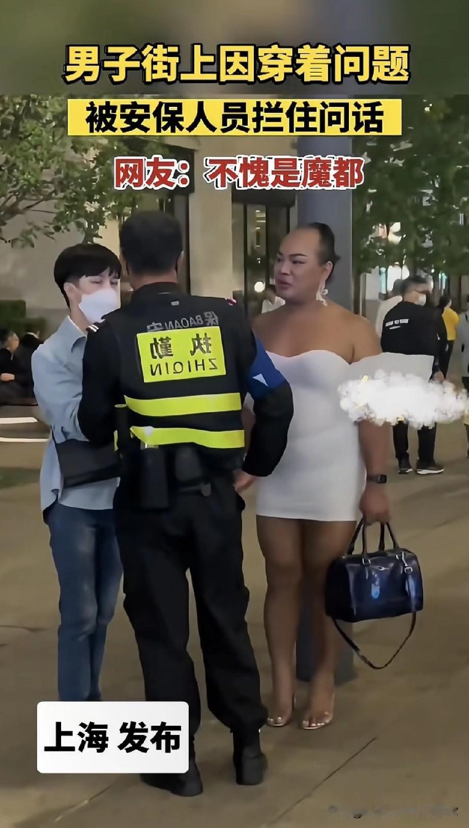 魔都街头保安都忍不住拦停问话! 快来看魔都这波操作!一男子穿抹胸白裙配精致手提包,直接被保安拦停问话,这画面冲击力绝了! 咱就说,魔都果然是魔都,穿搭都卷到保安都得出来“审审”了。这大胆穿搭走在街上,回头率不得拉满?但保安这一拦,是维护秩序还是管太宽? 有人觉得穿衣自由咱得尊重,有人觉得公共场合得有边界感。友友们,你们觉得这穿搭该被拦吗?穿衣自由和公共规范到底咋平衡?