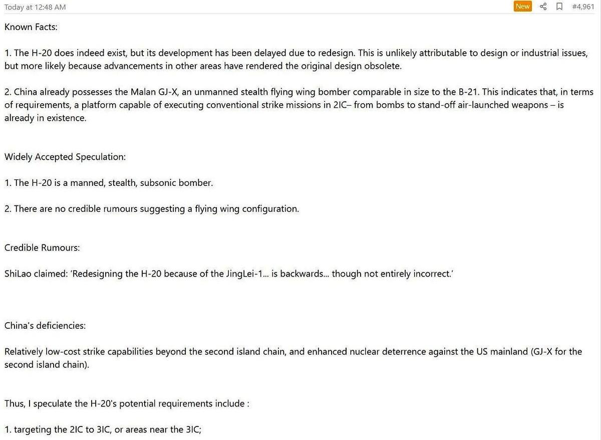 老外对轰20的研判:H-20确实存在,但其研制因重新设计而被延迟。 中国已拥
