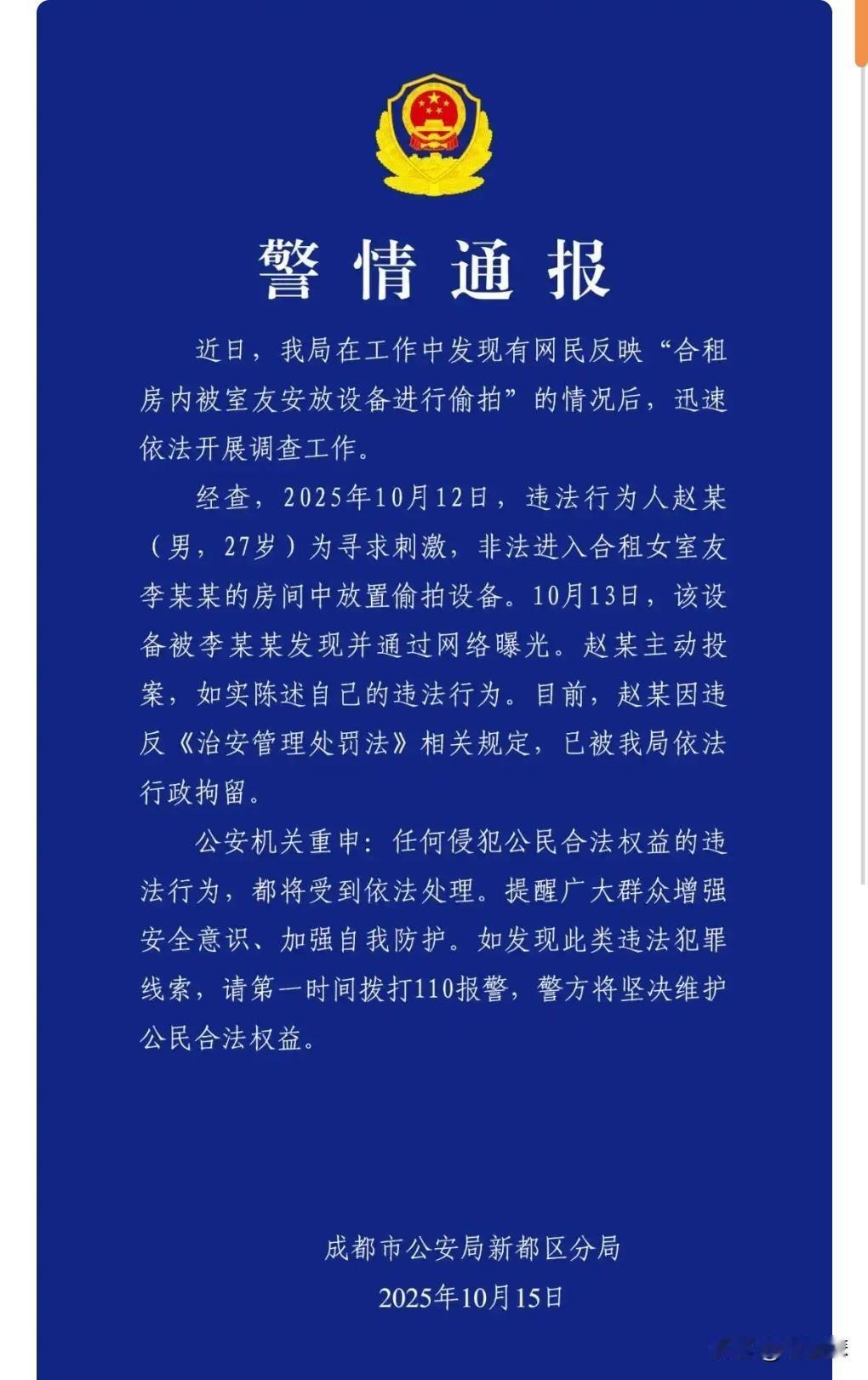 这男子真的是太心术不正了。 近日,男子安放设备偷拍女室友,结果被与室友发现并上传网上曝光,男子选择投案自首。 这真是敲响了警钟啊。 偷拍这种事情千万不能干。 男女合租确实有很多的不方便和一定的风险。 男女合租起码的分寸感还是要有的。