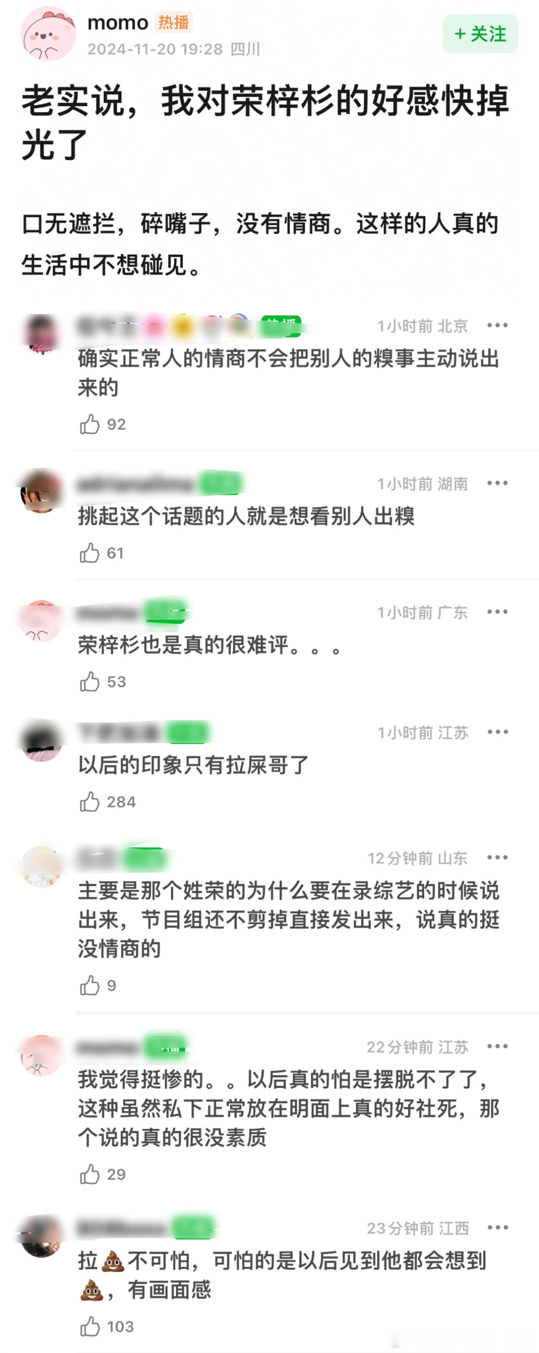 荣梓杉出道没多久🍉还挺多,上花少被批评耀祖作风,随口就曝其他成员糗事;之前还被