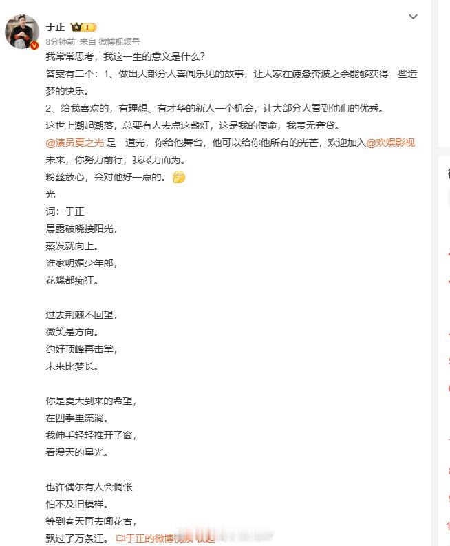 于正为夏之光写歌,欢娱官宣签约加码!从音乐到影视的全方位发展,夏之光的新起点太让人期待~于正为夏之光写了首歌欢娱官宣签约夏之光