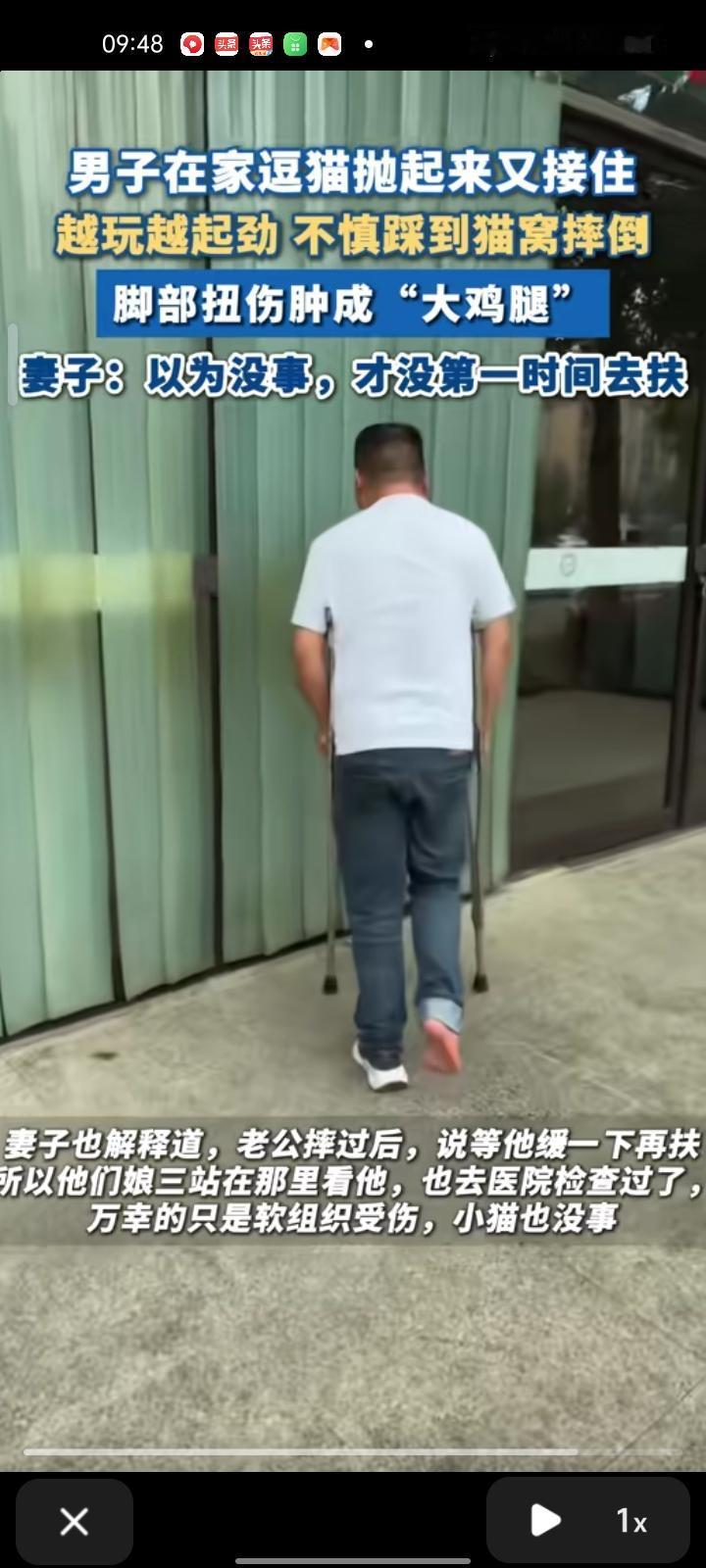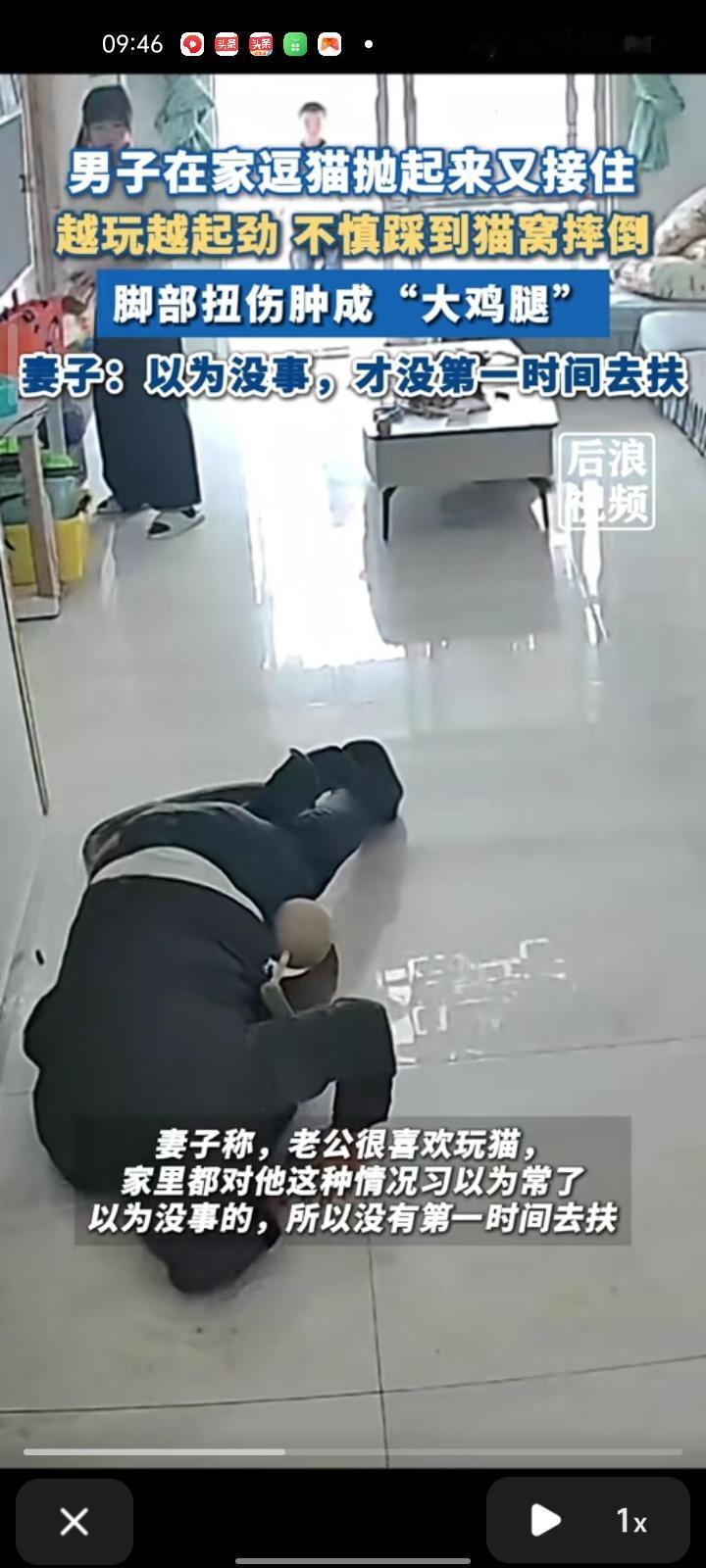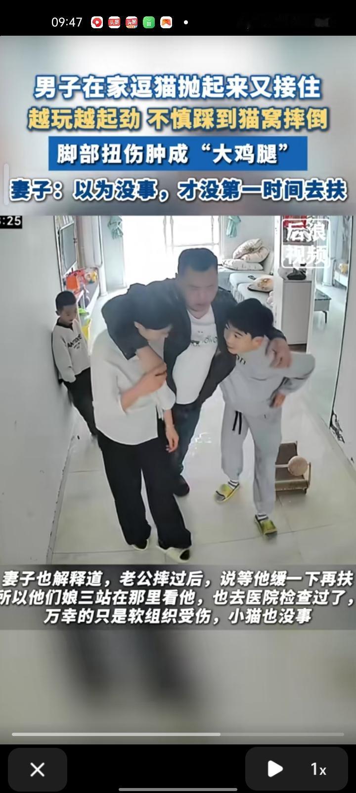 10月12日,滁州市凤阳县。男子在家逗猫抛起来又接住,玩着带劲时无意踩到猫窝摔倒了,脚部扭伤肿成“大鸡腿”。妻子称,老公很喜欢玩猫,家里的对他这种情况已经习以为常了,以为没事所以没有第一时间去扶。老公摔过后,说等他缓一下再扶,所以他们娘仨站在那里看他,也去医院检查过了,万幸只是软组织受伤,小猫也没事。