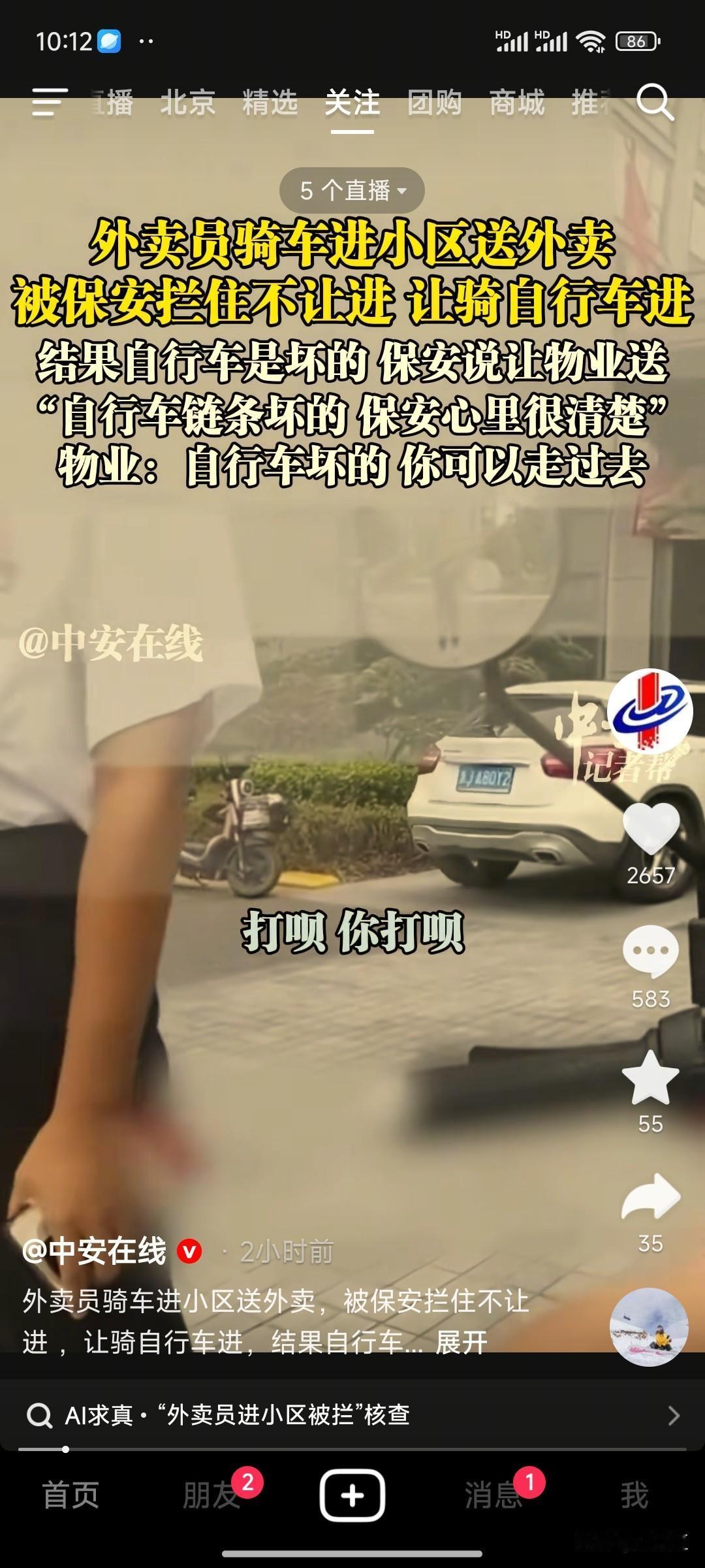 劳动者何苦要为难劳动者呢? 刚看了中安在线的一个报道,外卖员进小区送外卖,被保安阻止。外卖员与业主沟通后,业主让保安或者物业送,保安和物业改口说不让电动车进入,但小区提供自行车,让外卖员驱车送进去,这也可以,但自行车是坏的,问物业,物业回复自行车坏了你走进去啊! 大家都是基层的工作人员,上班为了糊口,将心比心,一个外卖员一天要送多少单,这一下耽误多少时间? 政策的制定要人性化,不要想当然,而各岗位的人员更要有同理心,同为基层工作人员,更要设身处地的想想!