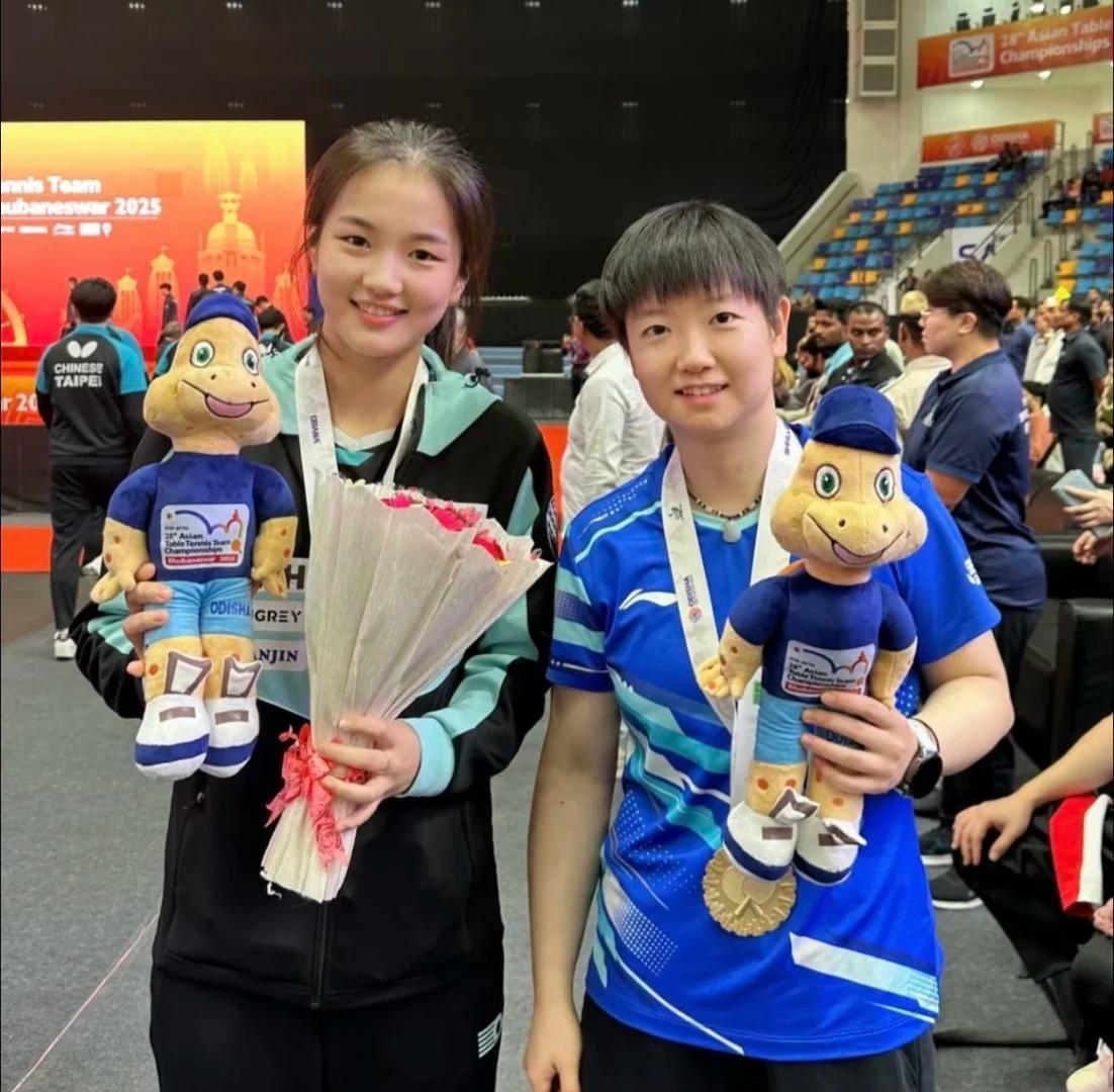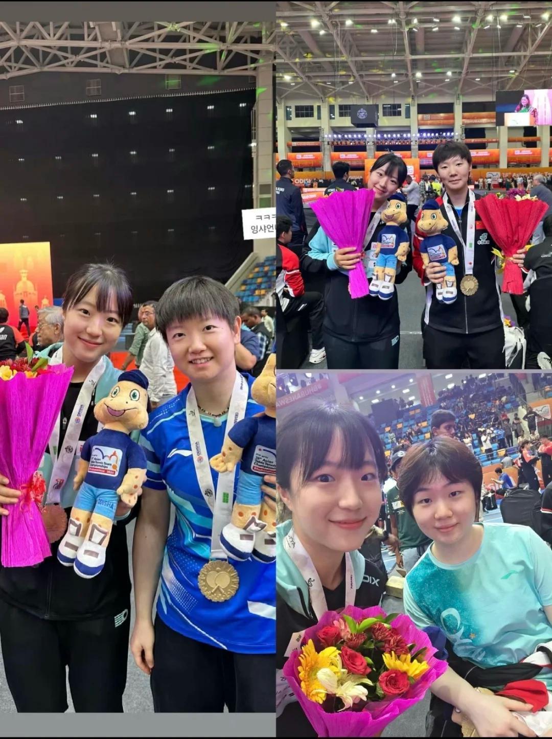 申裕斌分享和莎莎、曼昱、蒯曼的合影。 真的是赛场上是对手,赛场下是朋友,大家一直打比赛都打出感情来了。今年的亚锦赛韩国女队是拿到了铜牌,半决赛的时候输给了中国队,对于那场比赛记得很清楚,第一盘是莎莎对申裕斌,然后比赛场地有一边咋滴水,莎莎到了有水的那边就一直在近台打,不敢跑动,怕滑倒,小申到了那边也不敢跑。比赛结束后,国乒女队和韩国队握手,小申和莎莎握手后还顺势摸一下莎莎姐姐的肚子,都是可爱的女孩子。 昨晚的颁奖仪式结束后,运动员们都一起合影了,看到申裕斌分享了她和国乒女队的合影,外协选手里还是比较喜欢小申的,什么时候都是笑眯眯的。打了乒超后,感觉小申也涨球了,这就是女孩子之间的友情吧,小申和莎莎姐姐、曼昱姐姐都单独合影了,还和小曼姐一起拍照,都是美好的女孩子。 后面看到金娜英也晒了她和莎莎、王曼昱的合影,大家都很喜欢她们。今年亚锦赛,国乒女队也拿回了女团冠军,邱贻可第一次带女队参加升国旗的比赛,就夺冠了,真的幸福啊,而且还和自己的两个徒弟一起站上领奖台。