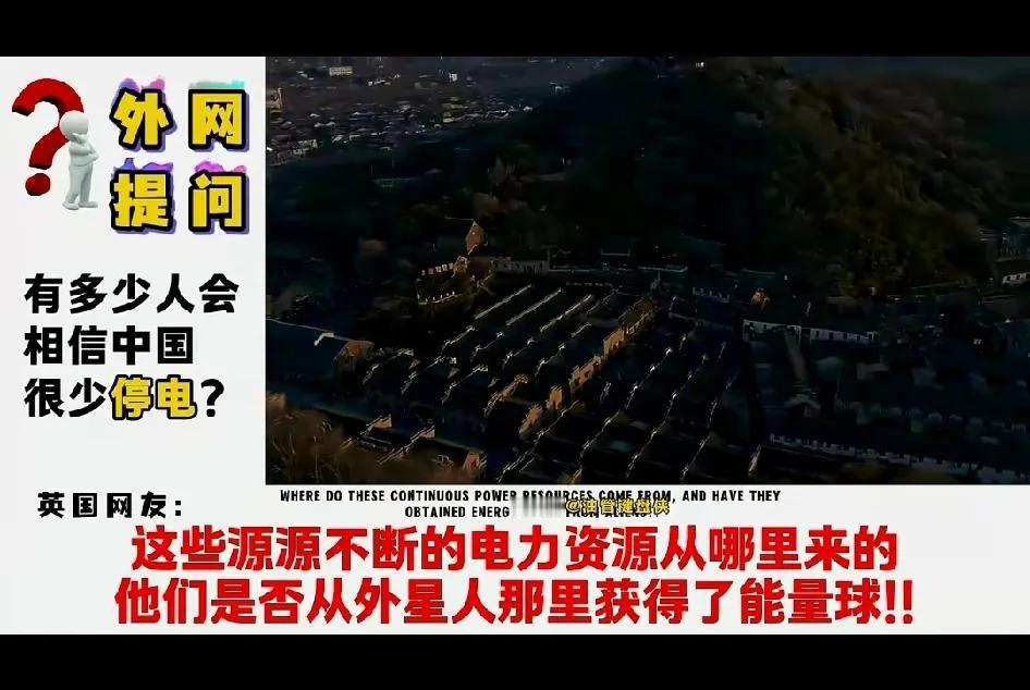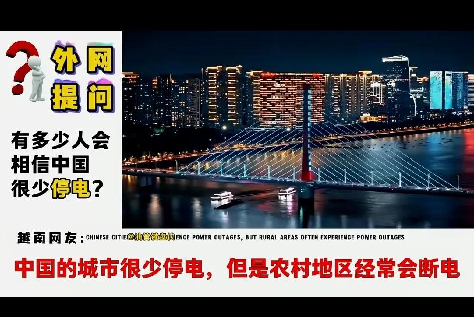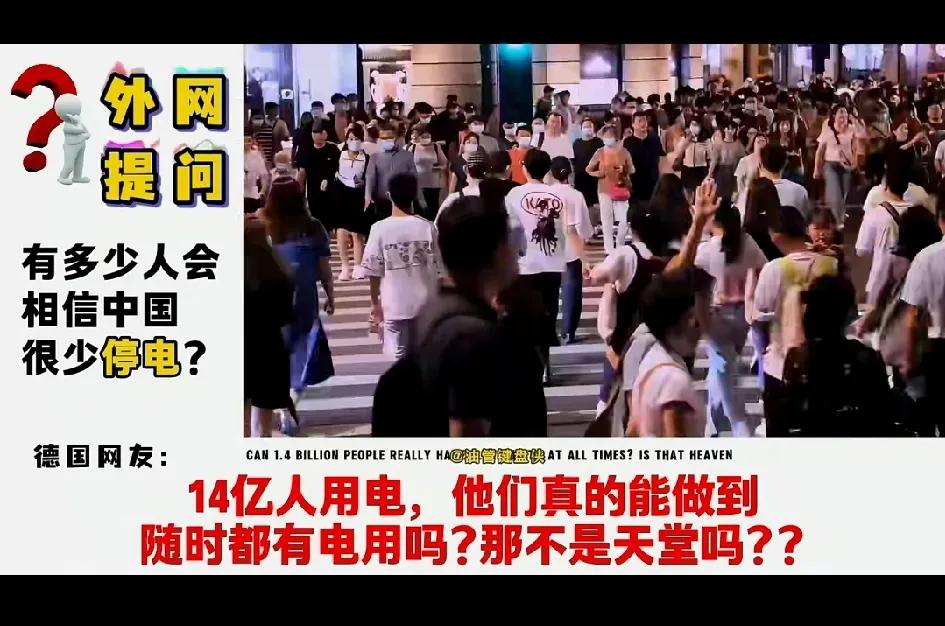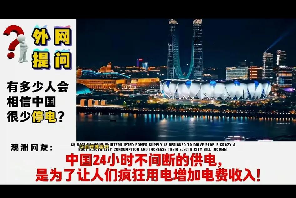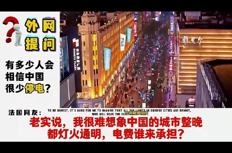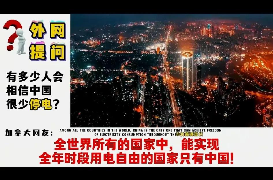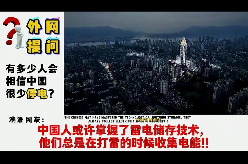 中国城市彻夜灯火通明,无论城乡24小时不断电,外国网民如何看? 对我们来说已经司空见惯的事情,没有想到还有这么多外国人表示不可思议,他们中有很多还是来自发达国家。实现用电自由这么容易的事情,在他们眼中,竟然成了一种奢侈。 印度人一如既往的自信心爆棚,他们认为中国24小时不断电根本就是假的:即使是在印度,也不可能做到全天24小时都保证有电,更别提中国了。 精明的法国人关心的是城市照明的电费由谁来出的问题:我很难想象中国的城市整晚灯火通明,电费由谁来承担?可以告诉你,反正不会由老百姓来承担。 德国人表示,能保证14亿人随时都有电用的国家,直接就是天堂。没想到德国人的格局如此之小。哈哈。 波兰人认为这样太浪费,这些电如果用来生产,会产生更多的价值:他们太笨了,如果把这些电用于工业生产,那将会造多少产品? 越南人认为中国的城市很少停电,但农村地区经常会断电。说得好像他真的非常了解中国似的。如果他知道农村和城市一样不停电,他会感到害臊吗? 澳大利亚人认为,中国24小时不停地供电,是为了让人们疯狂用电从而增加电费收入。看来这家伙是供电公司的。 英国人认为,中国这些源源不断电力,有可能是从外星人那里获得了能量球!目前做不到,不排除将来会实现。 那么,中国究竟从哪里获得如此多的电能,竟然能让整个国家实现24小时不停电的呢?让这个澳大利亚网民代替我们来回答——中国人掌握了雷电储存技术,我们总是利用打雷的时候收集电能!