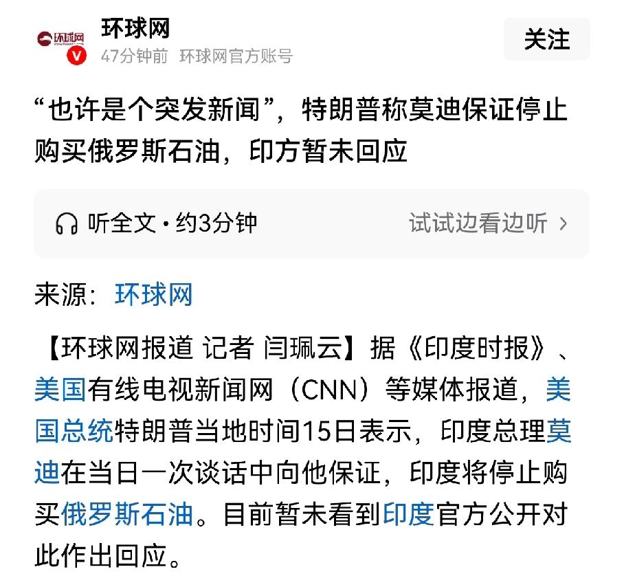 “也许是个突发新闻”,川普再次收到莫迪保证,印度不再购买俄石油,环球网这波操作,我给满分,“元芳”(莫迪)你怎么看? 原来看新闻,一看央妈发的,嗯,这个靠谱。 现在看新闻,一看央妈发的,嗯,这不是“冒牌”吧? 玩笑而已,我想说的是这篇关于川普的最新表态,他再次说莫迪向他保证,印度迈出了一大步,将停止购买俄罗斯石油。 看完我立马想到上次他也是这么说的,而印度官员则很快回应,消息不实,将继续购买俄罗斯石油。 尽管环球网报道用了印度暂未回应,但我还是赶紧扒拉外网信息,结果还真没有。 这么看,就不难理解那句“也许是个突发新闻”,毕竟他太不靠谱了,如果说突发新闻,印方突然又站出来了说,我们将继续,这就不好办了…… 有句话说,打败魔法的不一定是魔法,但恶人还需恶人磨可是真理。 所以,球到了印度一边,你猜莫迪会怎么回应?